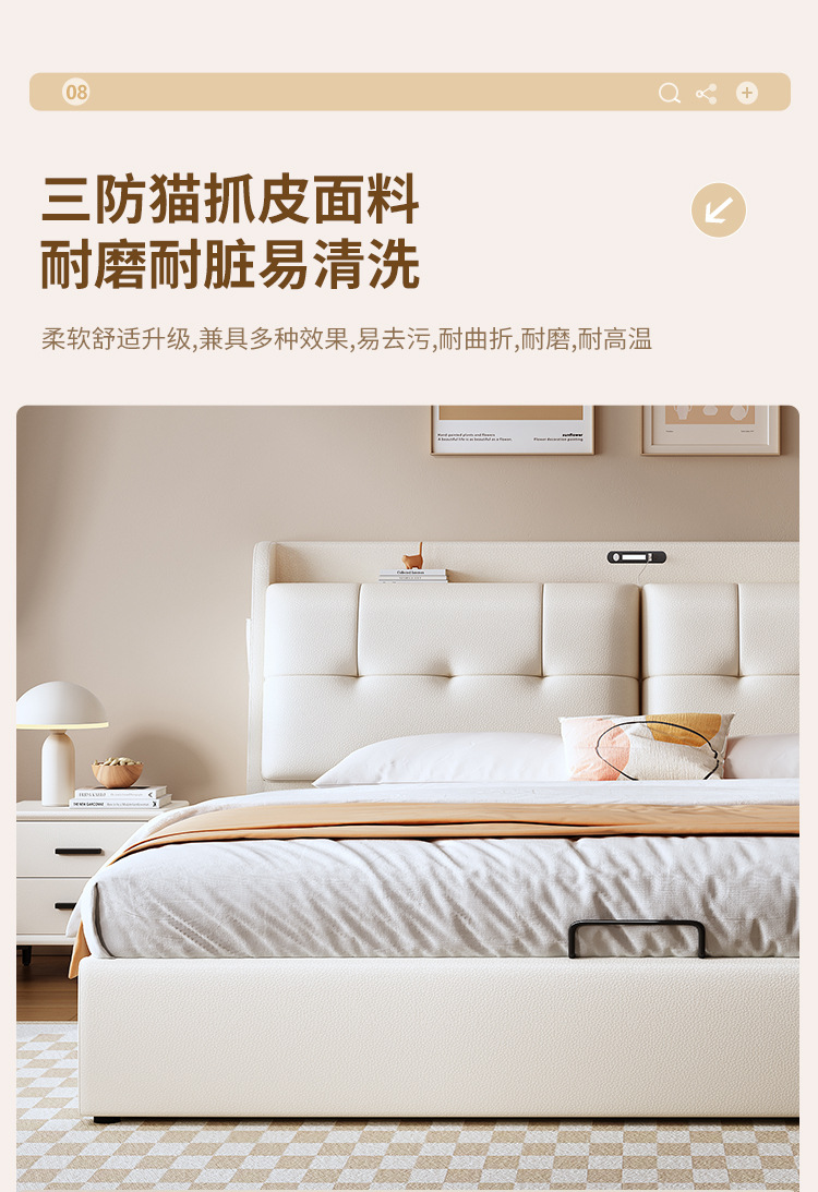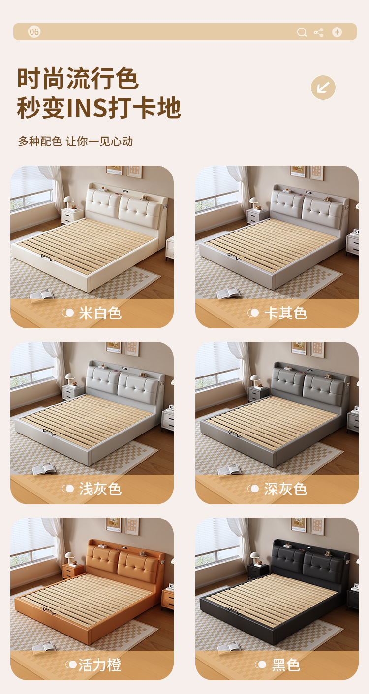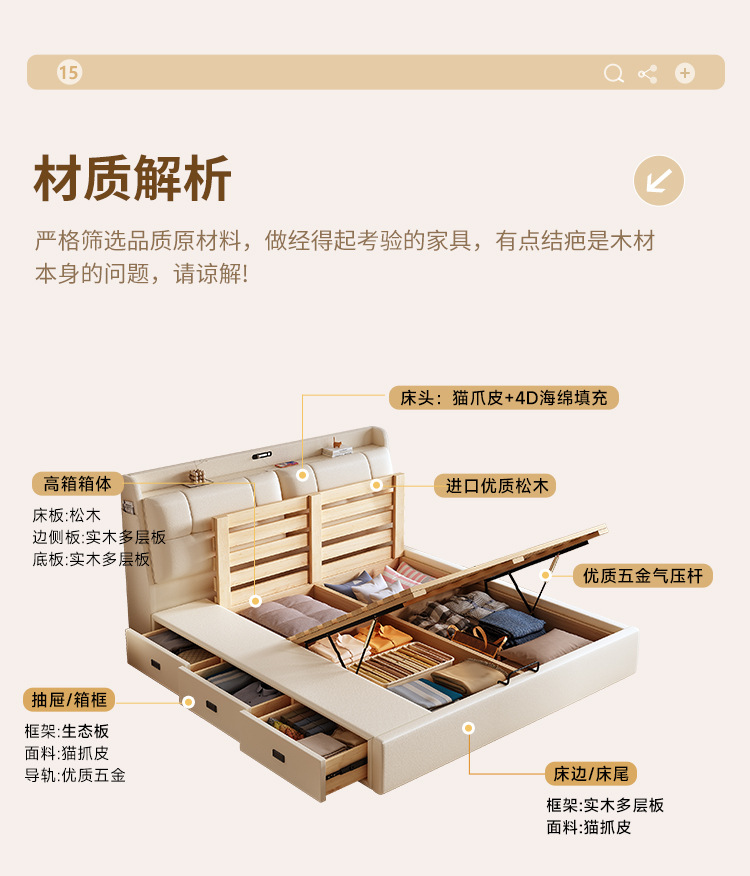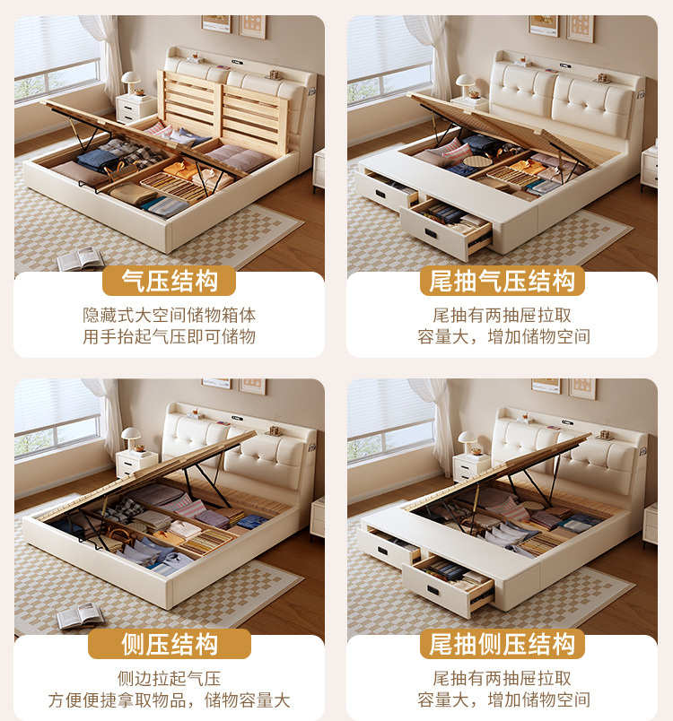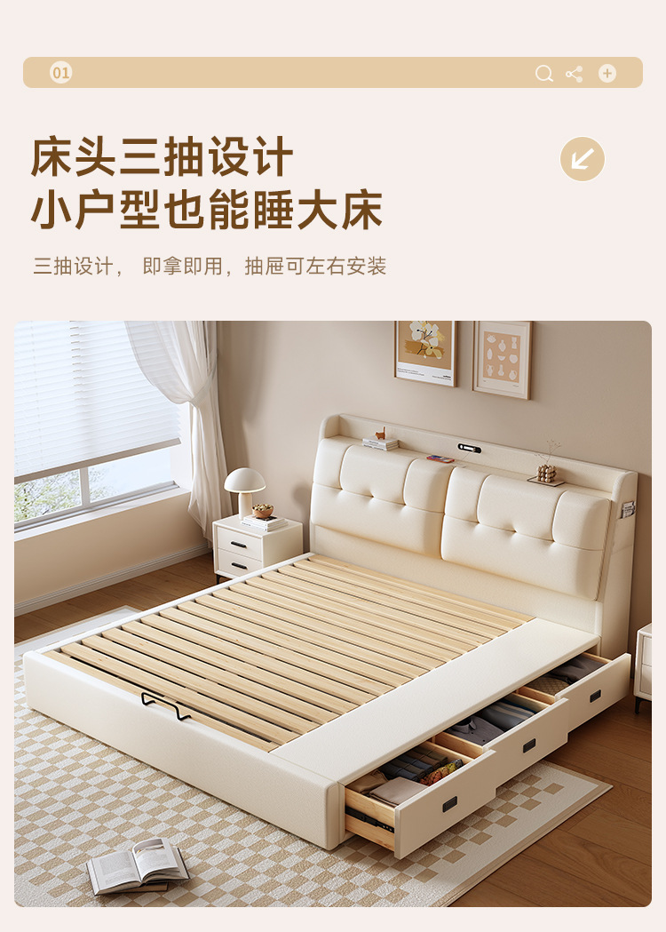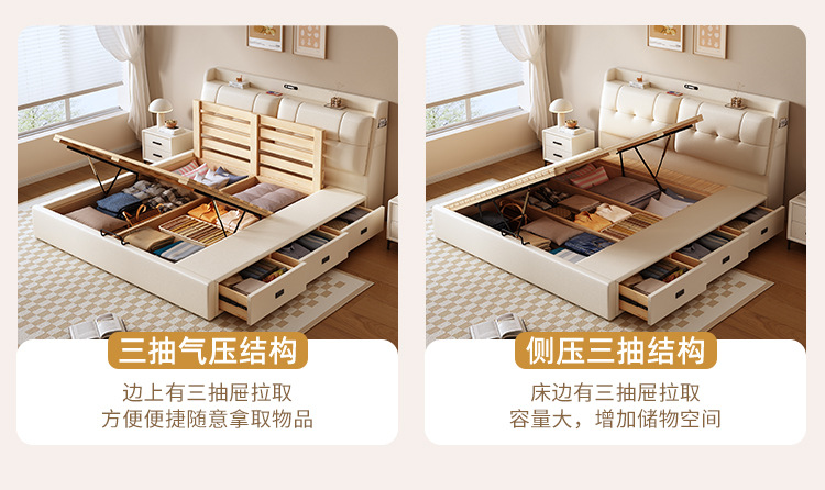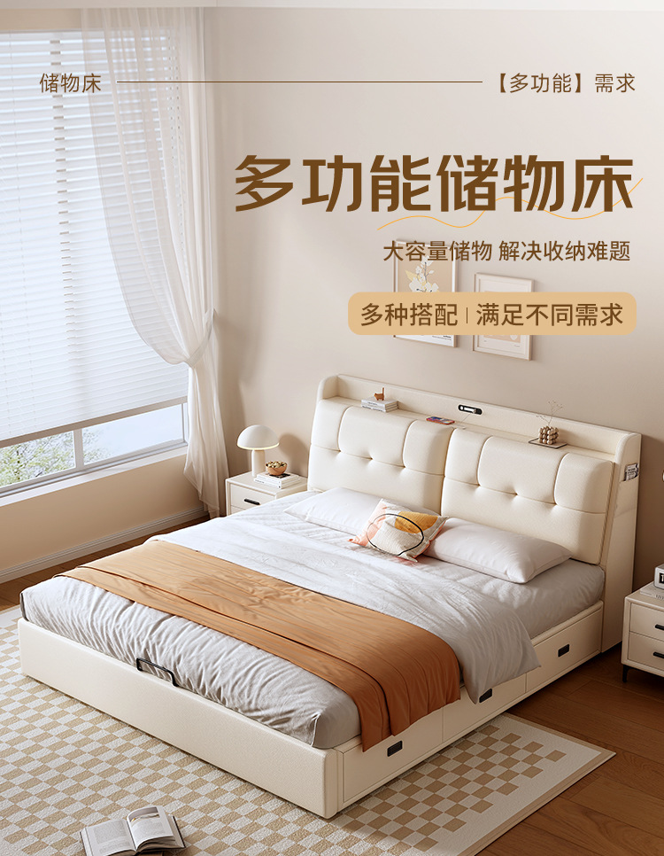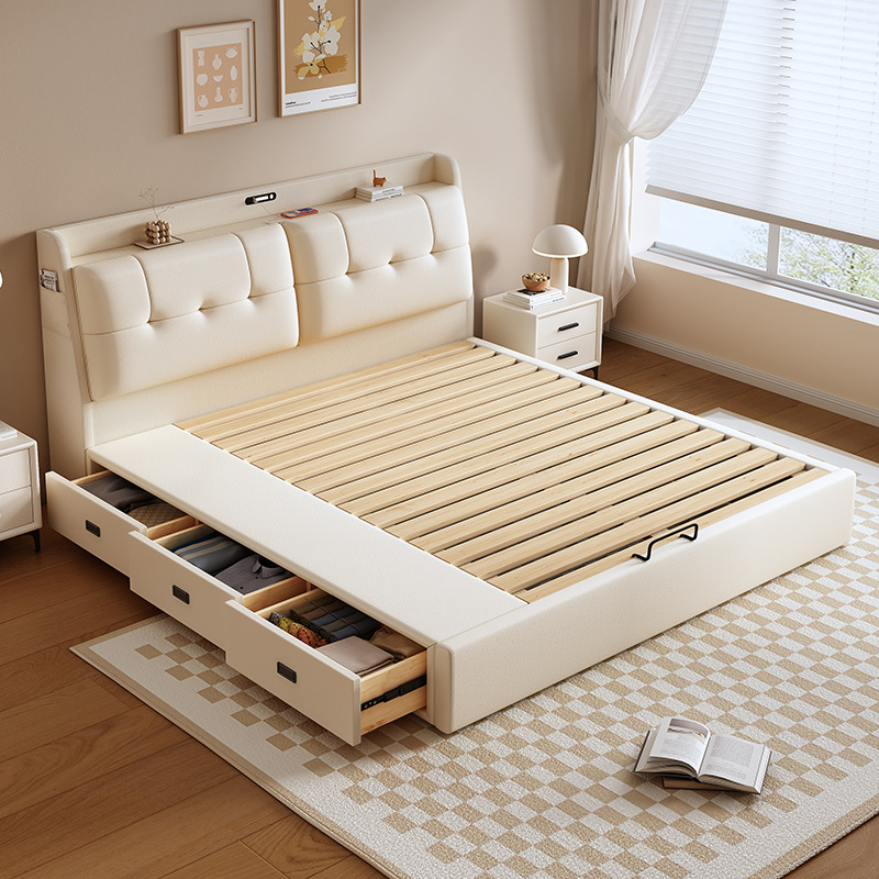 현대적인 미니멀리스트 다기능 가죽 침대 1.8m 서랍이 있는 하이박스 수납 라이트 럭셔리 소프트 백 하이엔드 원목 더블 웨딩 침대스토어 가기