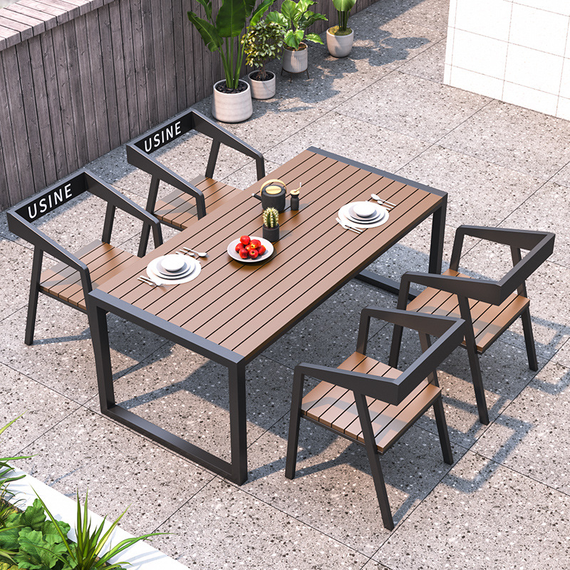산업 스타일 철 야외 안뜰 발코니 테이블과 의자 야외 야외 태양 보호 방수 차 식탁 플라스틱 나무 테이블과 의자 조합