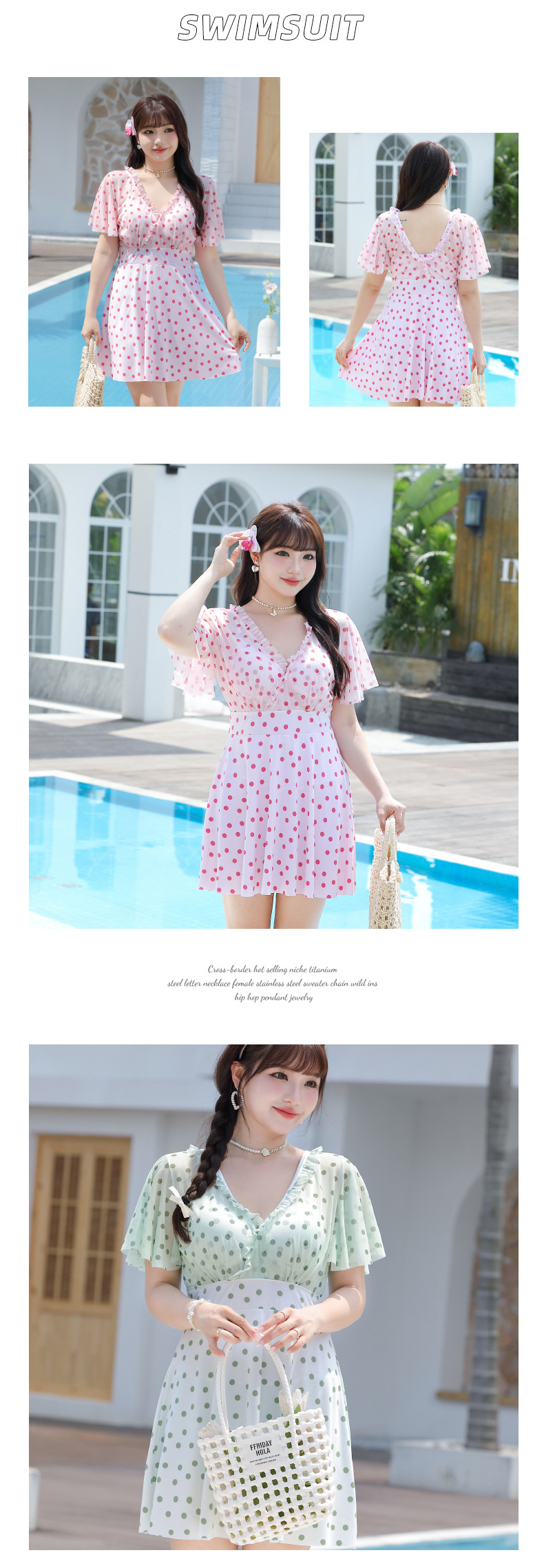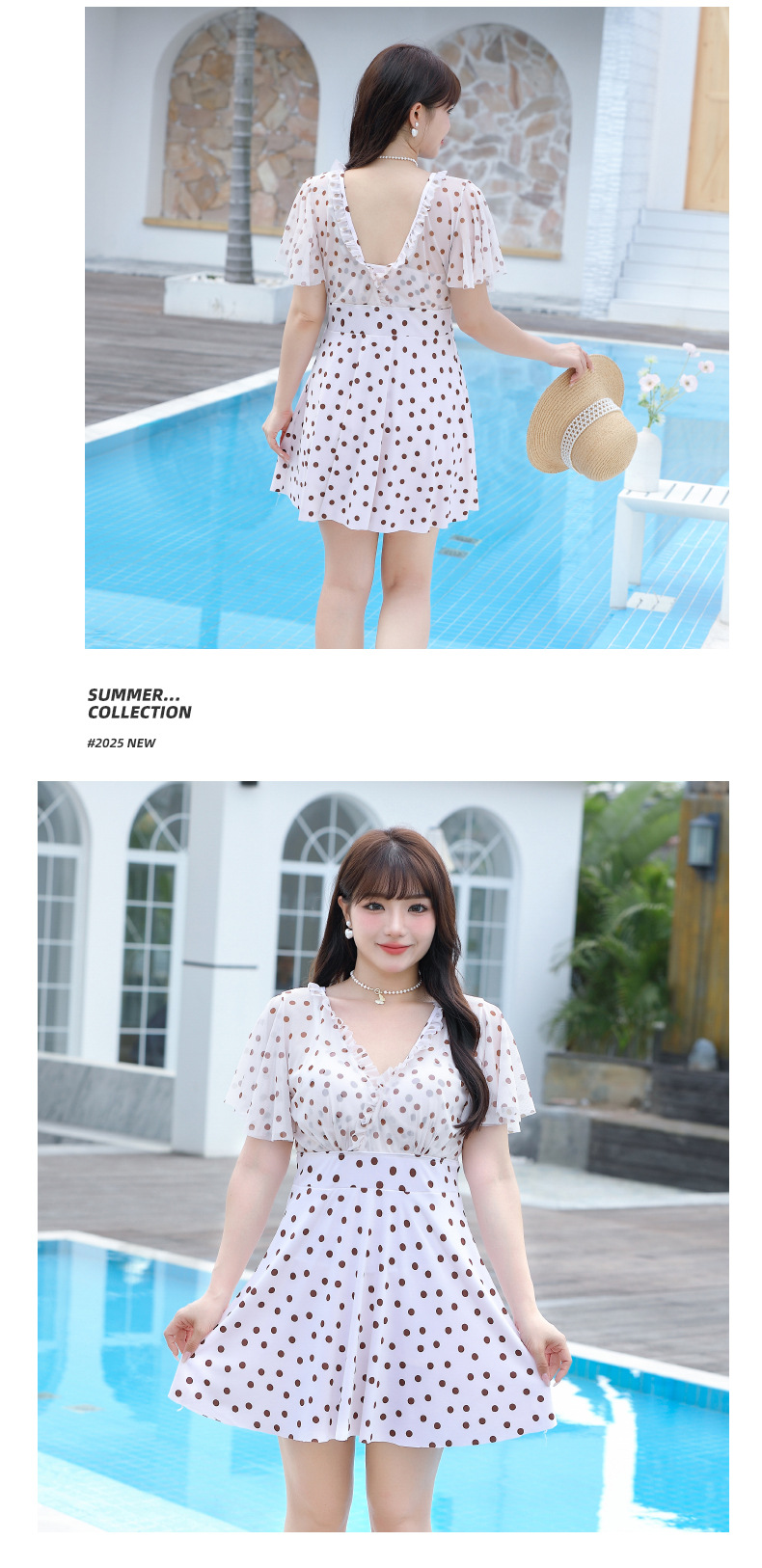 여성용 리조트 스커트 스타일 브이넥 수영복 도트 장식 러플 플러스 사이즈 의류 비치 스파 리조트 의류 재고 있음