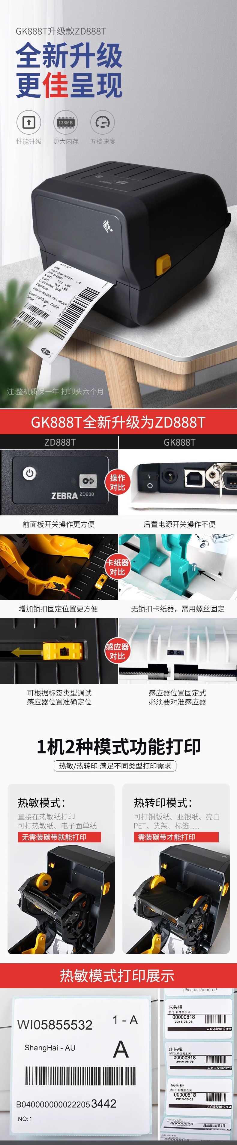 ZEBRA ZD888T 열 라벨 바코드 프린터 QR 코드 자체 접착 익스프레스 청구서 작은 청구서