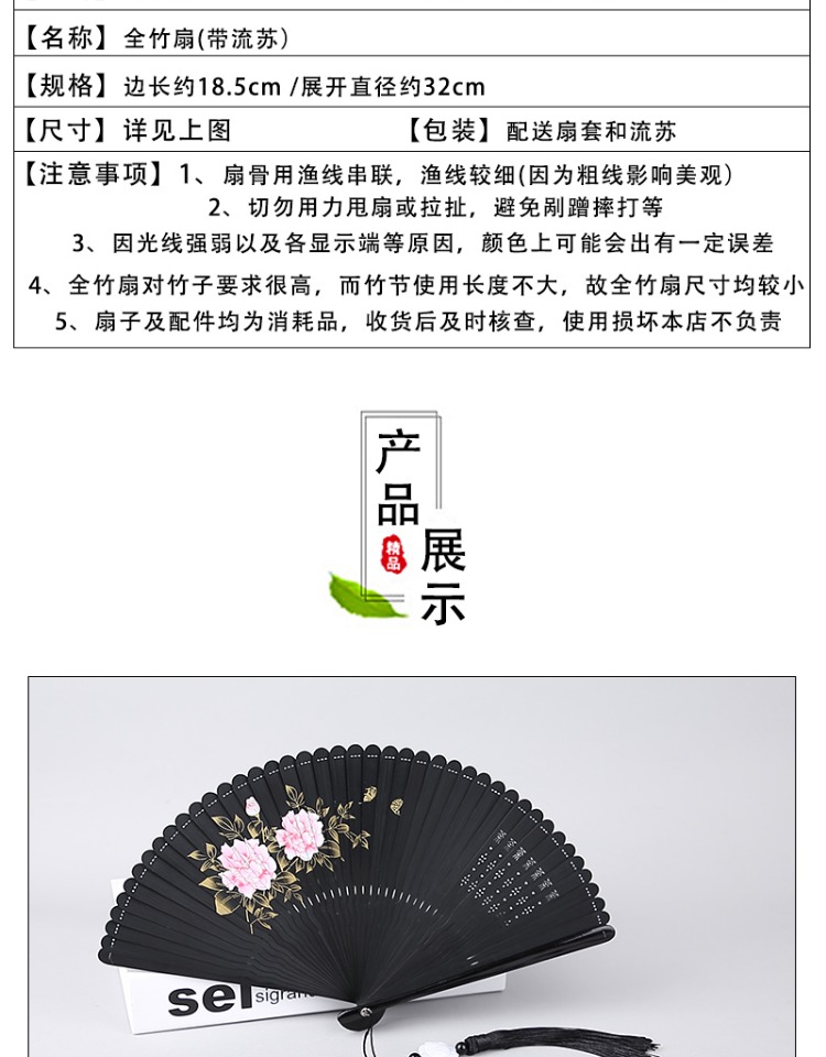 전체 대나무 본체 부채, 중국 스타일 여성 수제 일본식 골동품 접이식 Hanfu 댄스 부채, 휴대용스토어 가기