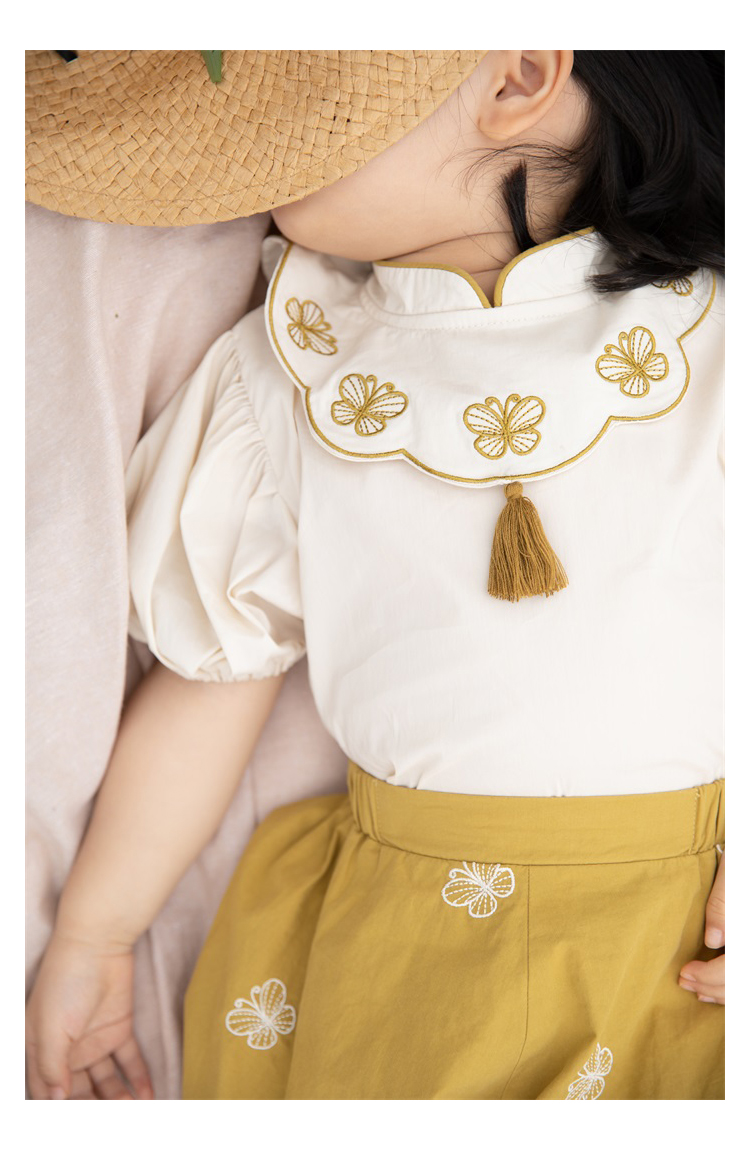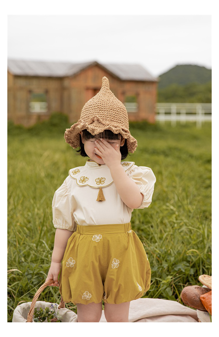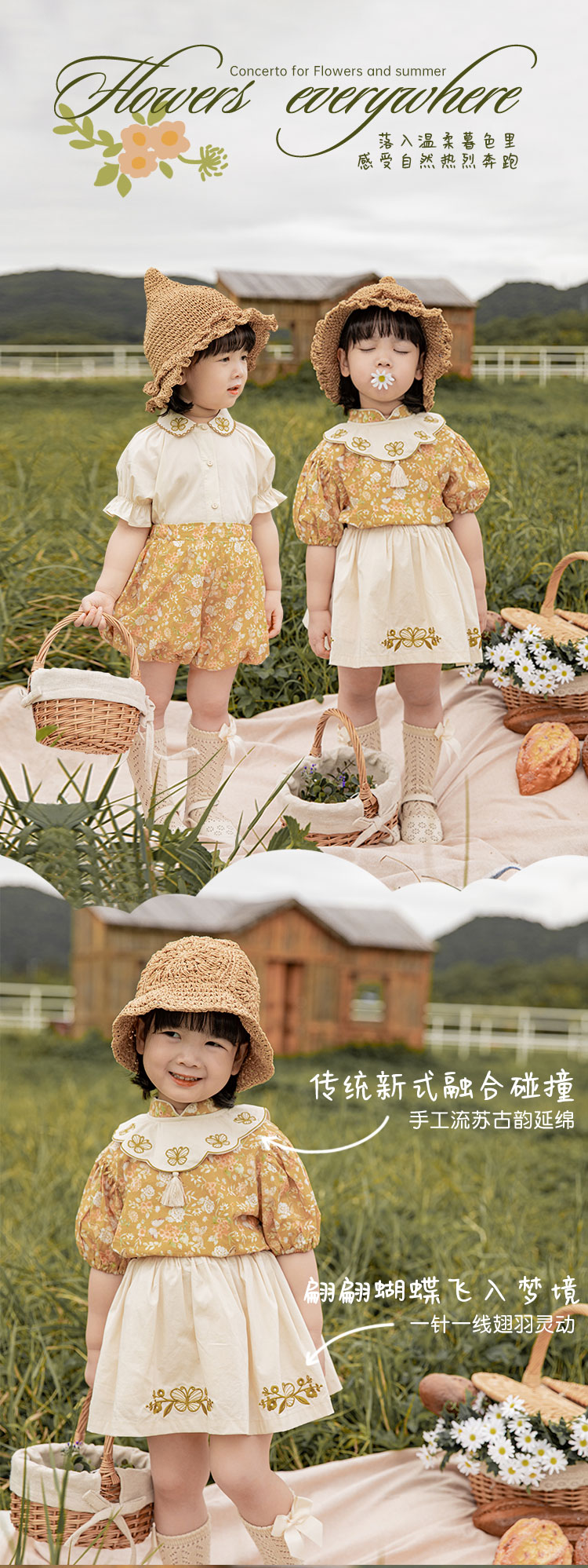 Wulibuyi 여름 목가적 스타일 소녀 자수 대비 인형 칼라 드레스 아기 반팔 반바지 정장 유행
