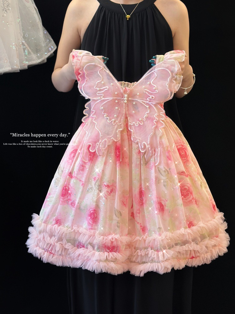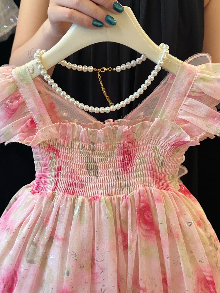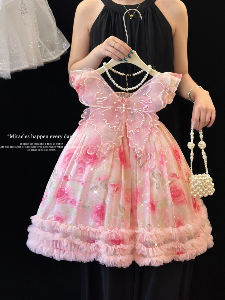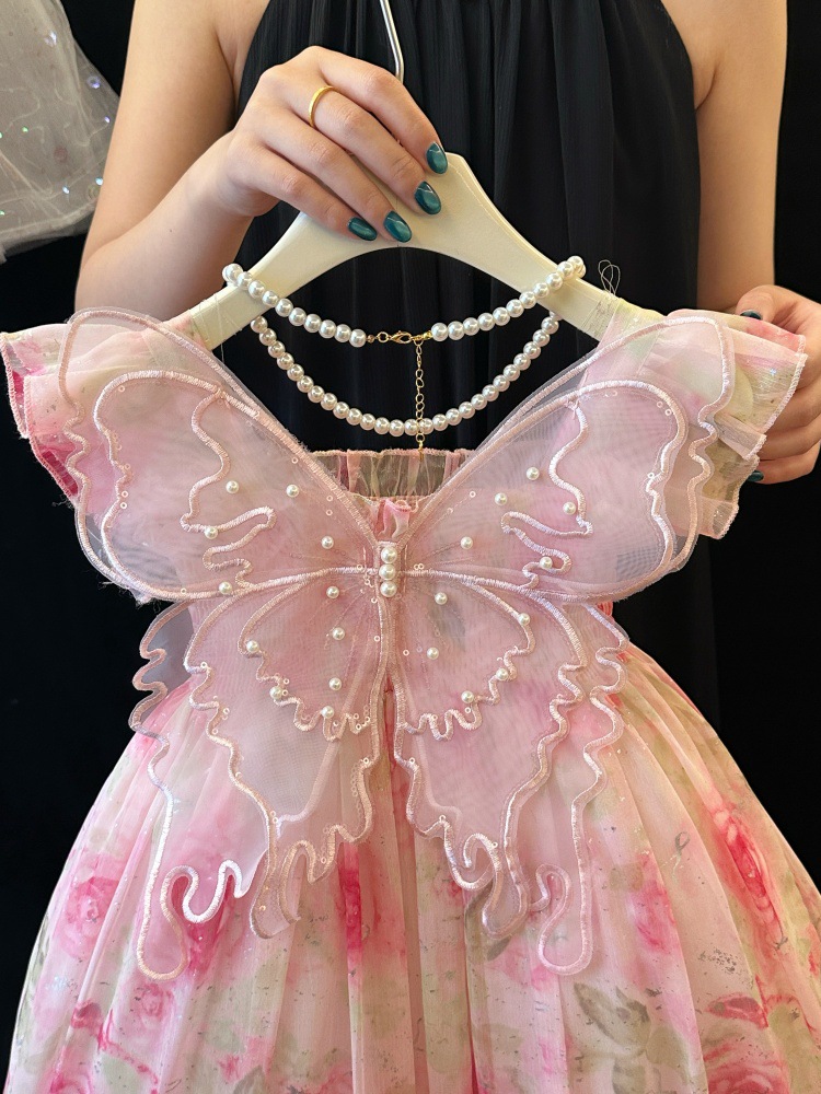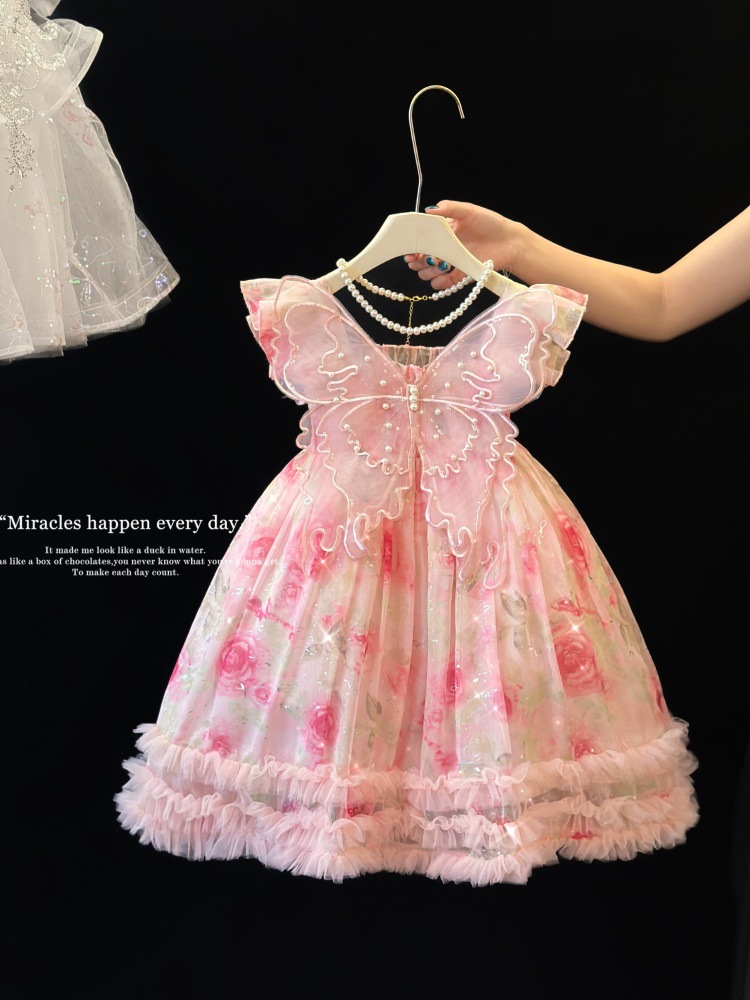 여자 날개 공주 드레스 여름 드레스 2025 새로운 어린이 생일 드레스 스커트 유행 여자 핑크 드레스스토어 가기