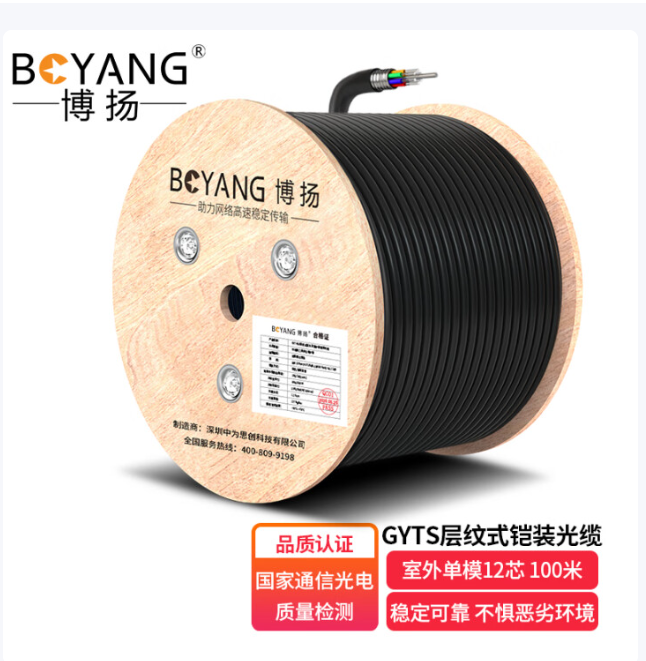 博扬 GYTS铠装室外光缆 12芯单模光缆 通信光纤光缆防鼠咬 层绞式室外架空/管道 100米 BY-GYTS-12B1.3*1 合格证*1 保修卡*1