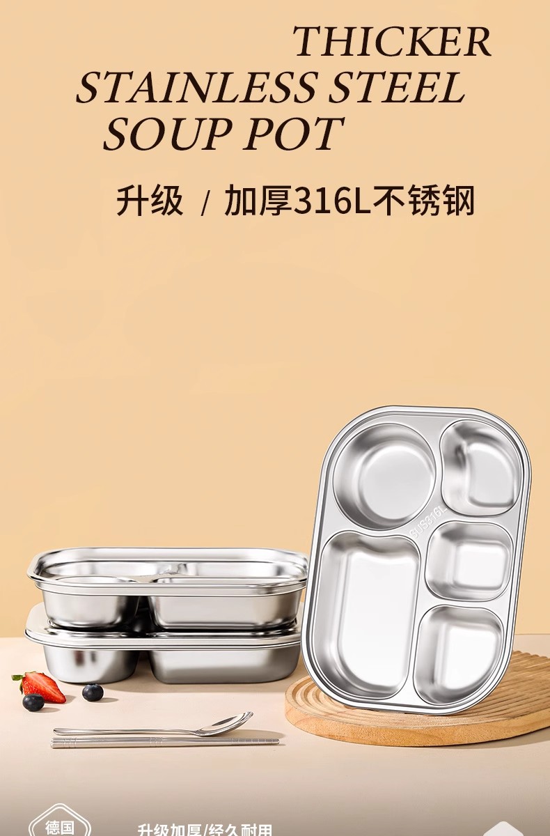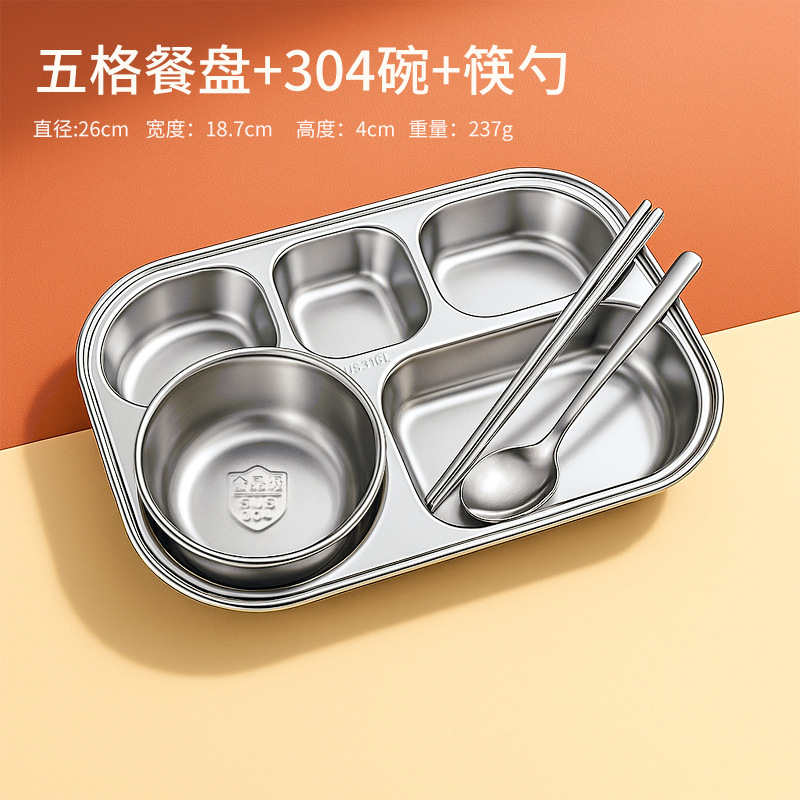 316 식품 등급 스테인레스 스틸 디너 플레이트 둥근 모서리 디너 플레이트 학교 캔틴 어린이 식기 뚜껑 그릇과 젓가락 스푼