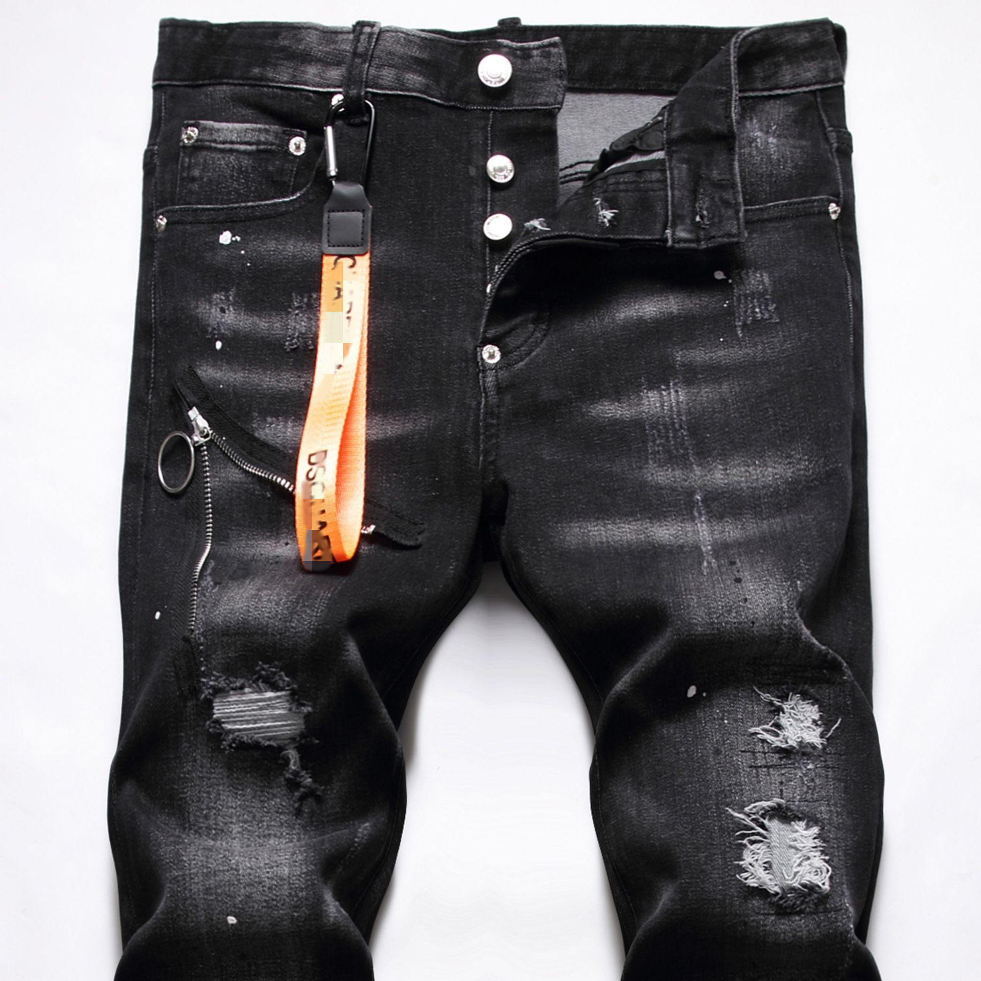 유럽과 미국의 트렌디 브랜드 Dsq2 패션 블랙 그레이 스트레치 페인트 도트 장식 지퍼 끈 찢어진 패치 청바지 남성용