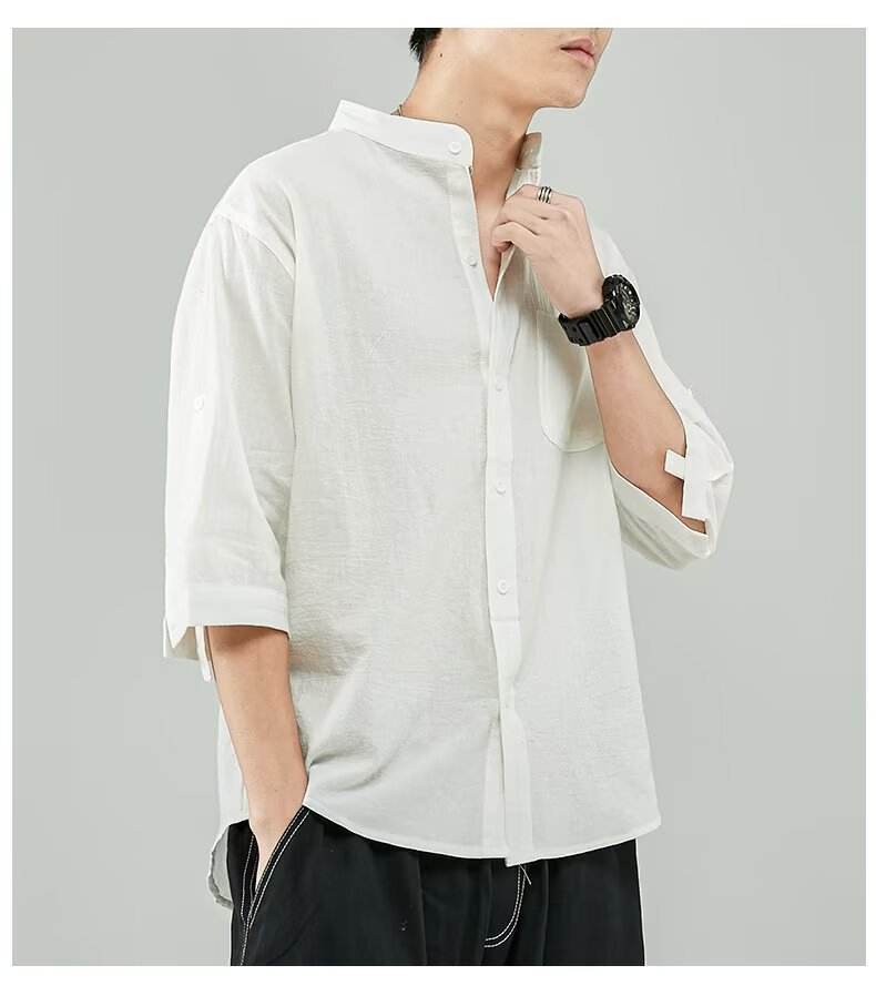 Guochao 스탠드 칼라 멋진 7부 소매 셔츠 남성용 새로운 트렌디 루즈 대형 캐주얼 다용도 솔리드 컬러 반소매 셔츠스토어 가기