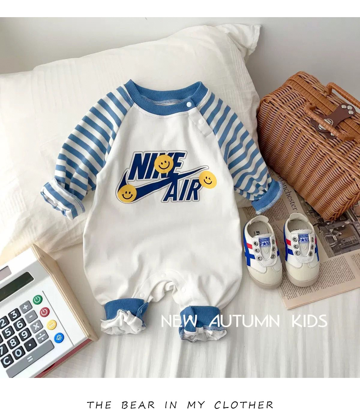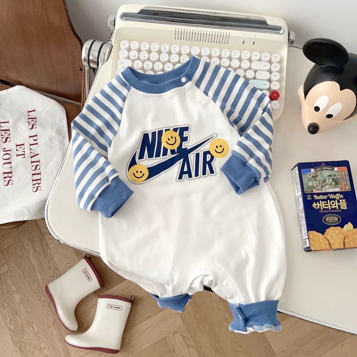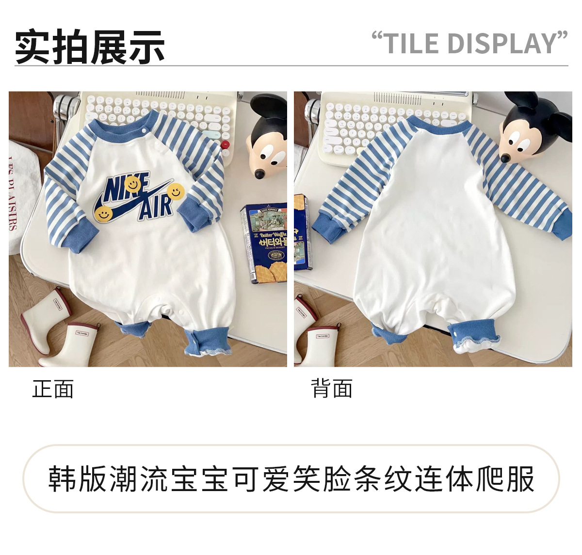 가을 신상 아기 점프수트, 한국식 슈퍼 귀여운 스플리싱 인터넷 연예인 크롤링 슈트, 외출 아기옷, 가을 신상스토어 가기