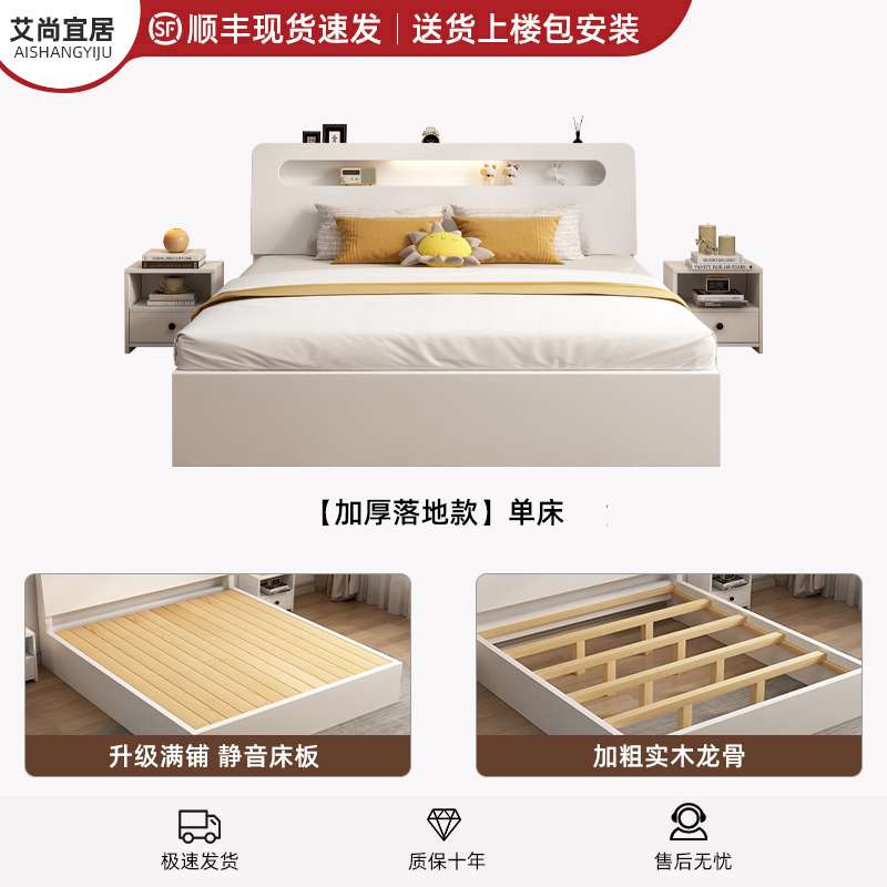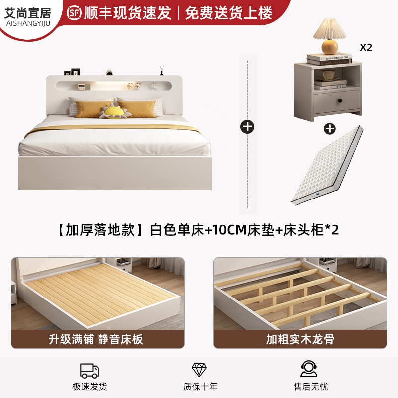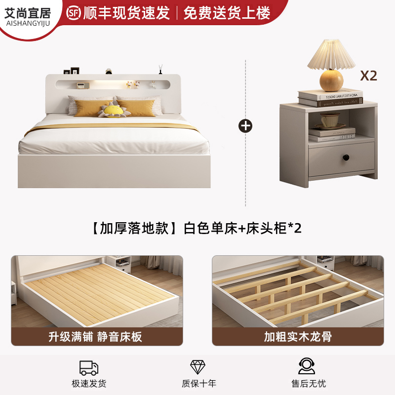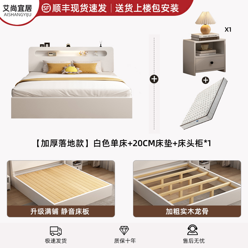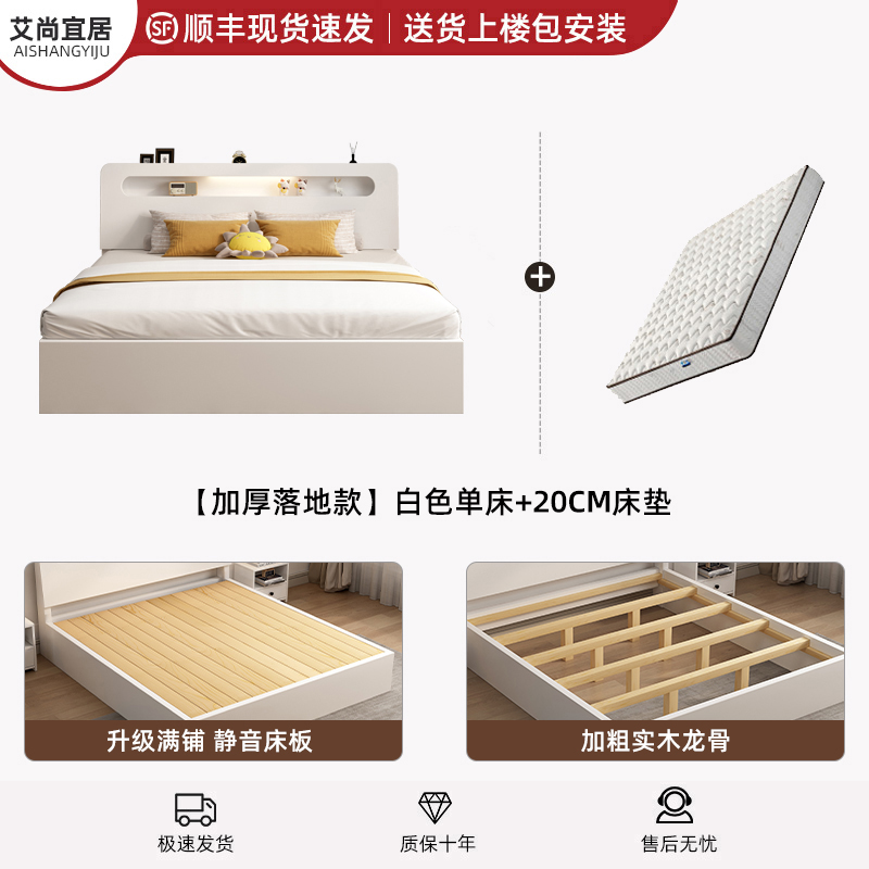 • [두꺼운 플로어 스탠딩 모델] 따뜻한 화이트 싱글 침대 + 20CM 매트리스 + 침대 옆 테이블 * 2 [위층 패키지 설치]