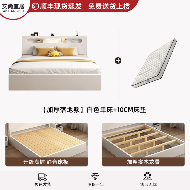 • [두꺼운 플로어 스탠딩 모델] 따뜻한 화이트 싱글 침대 + 10CM 매트리스 + 침대 옆 테이블 * 1 [위층 패키지 설치]