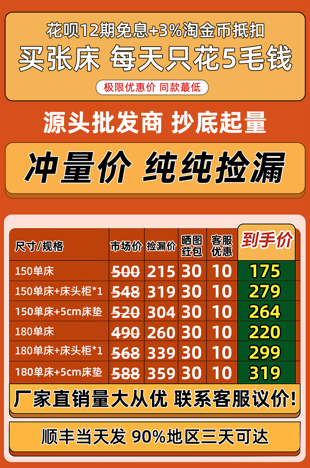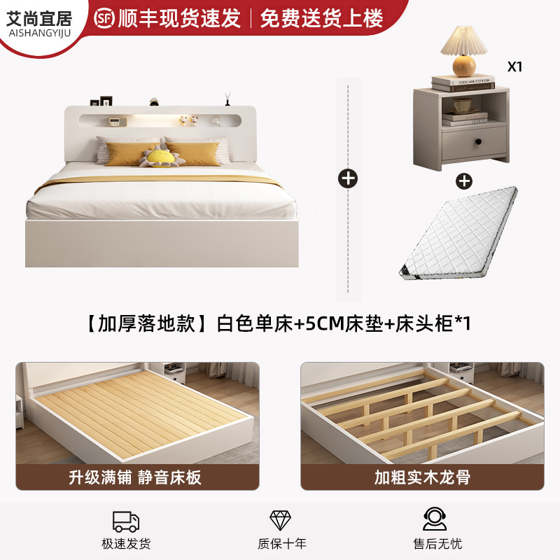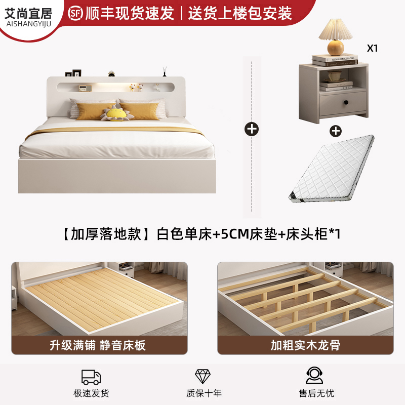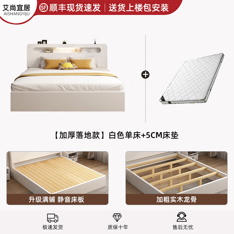 • [두꺼운 플로어 스탠딩 모델] 따뜻한 화이트 싱글 침대 + 5CM 매트리스 + 침대 옆 테이블 * 1 [위층 패키지 설치]