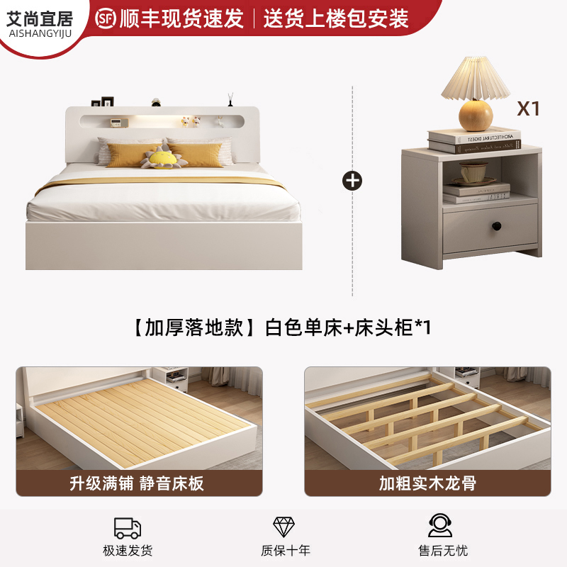 • [두꺼운 플로어 스탠딩 모델] 따뜻한 화이트 싱글 침대 + 10CM 매트리스 + 침대 옆 테이블 * 1 [위층 배송]