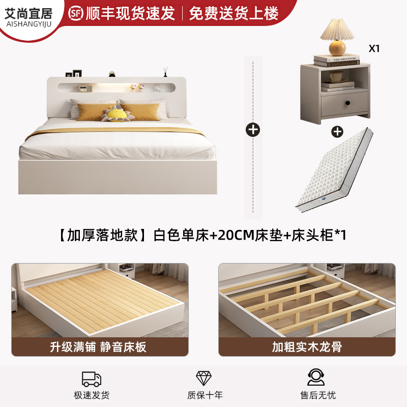 • [두꺼운 플로어 스탠딩 모델] 따뜻한 화이트 싱글 침대 + 20CM 매트리스 + 침대 옆 테이블 * 1 [위층 배송]