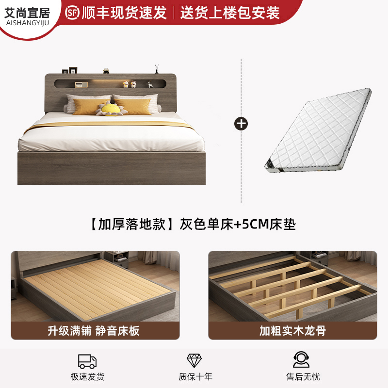 • [두꺼운 플로어 스탠딩 모델] 그레이 오크 싱글 침대 + 20CM 매트리스 + 침대 옆 테이블 * 1 [위층 패키지 설치]
