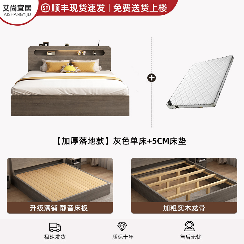• [두꺼운 플로어 스탠딩 모델] 그레이 오크 싱글 침대 + 10CM 매트리스 + 침대 옆 테이블 * 1 [위층 패키지 설치]