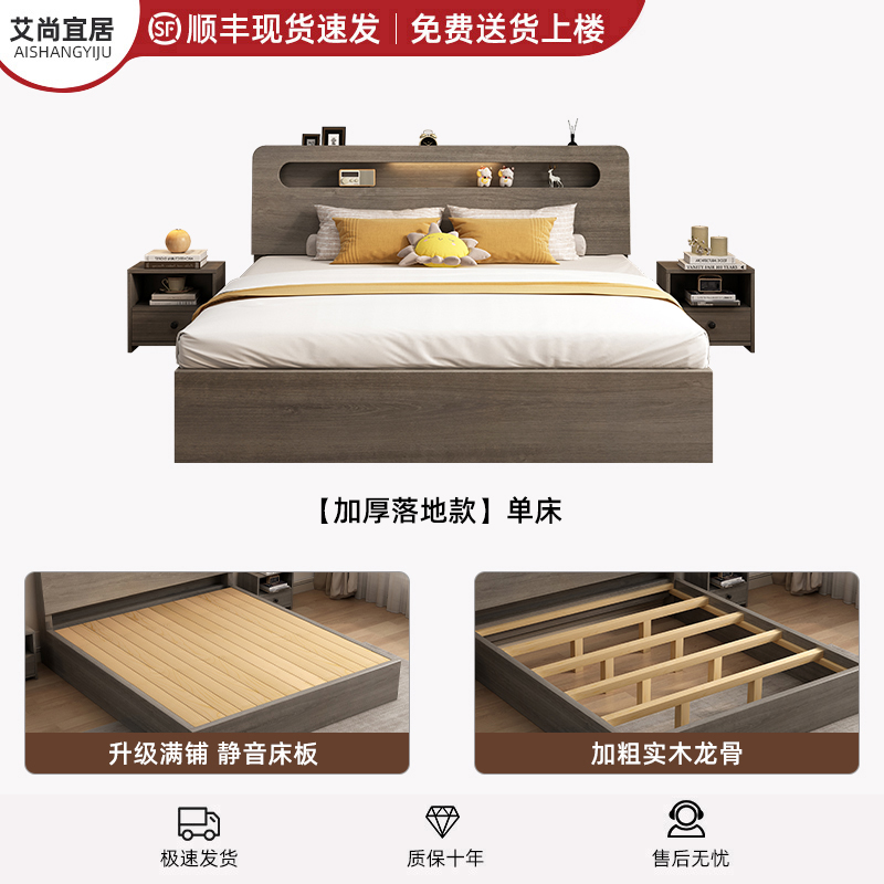 • [두꺼운 플로어 스탠딩 모델] 그레이 오크 싱글 침대 + 10CM 매트리스 + 침대 옆 테이블 * 2 [위층 패키지 설치]