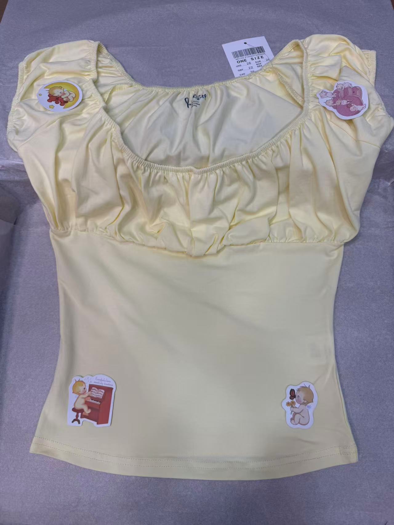 BM 스타일 구스 옐로우 라지 라운드 넥 플리츠 반팔 티셔츠 여성용 퓨어 디자이어 슬림핏 아름다운 퍼프 슬리브 탑 여름스토어 가기