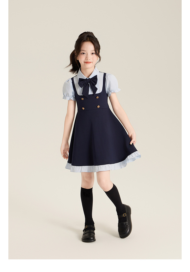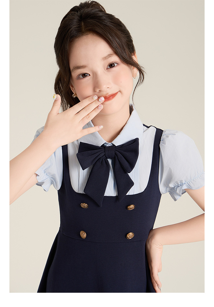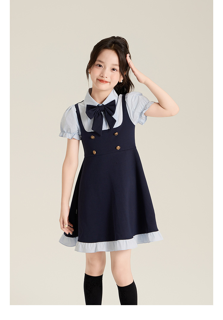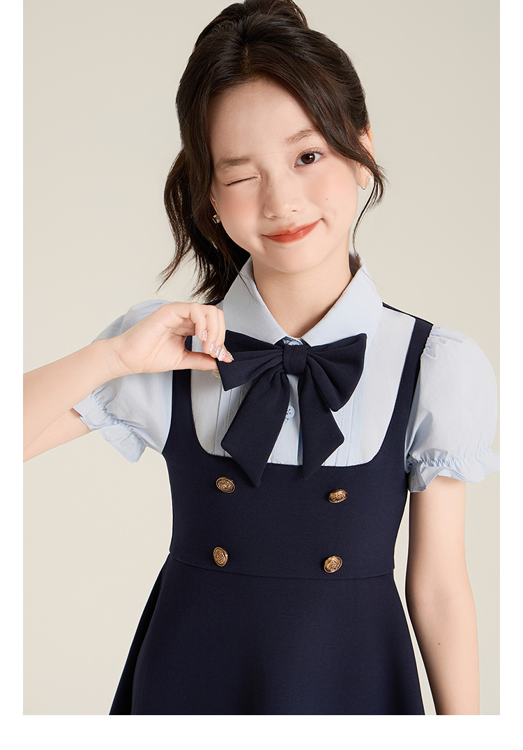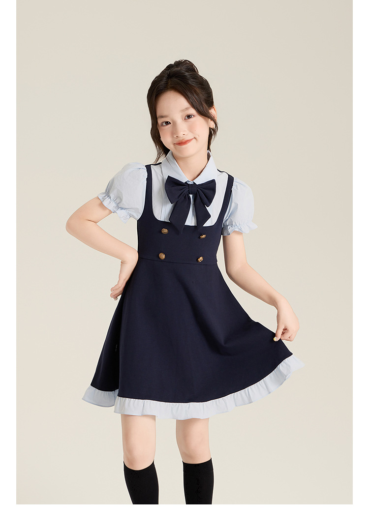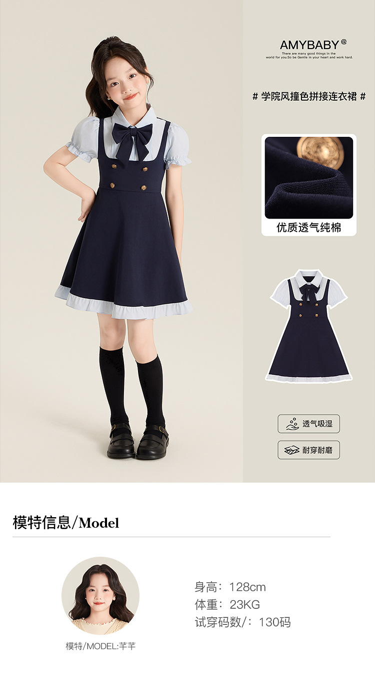 Amybaby 여자 스커트 여름 2025 새로운 대학 스타일 달콤한 가짜 투피스 보우 A 라인 드레스