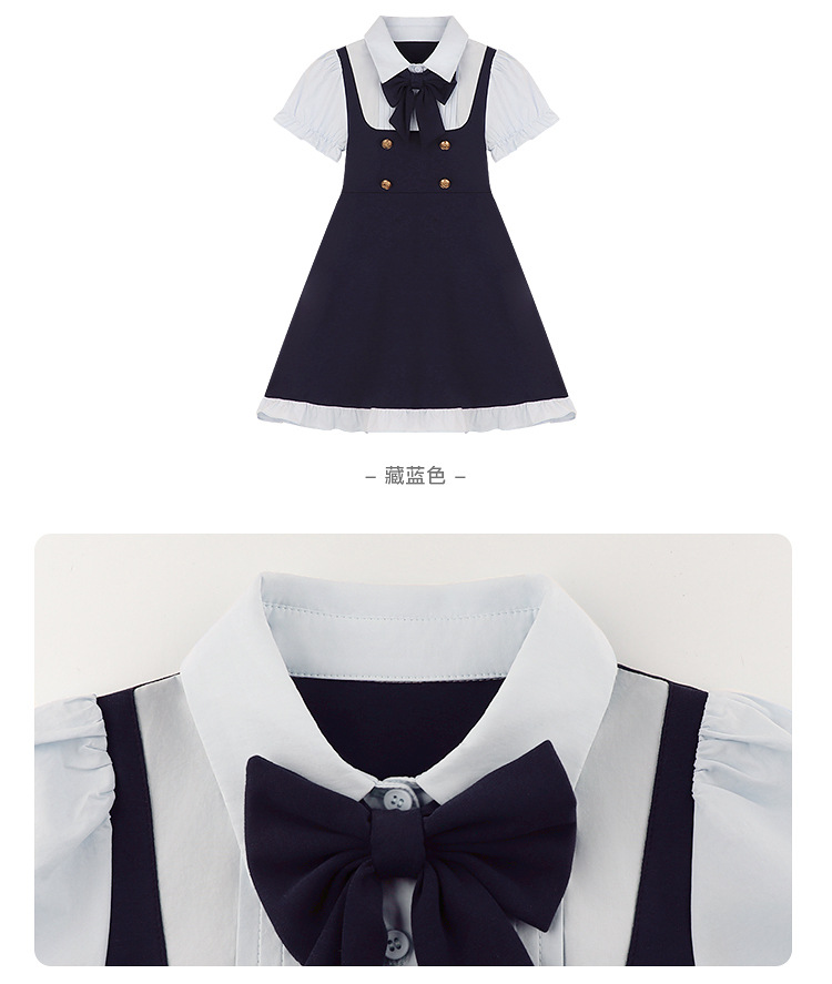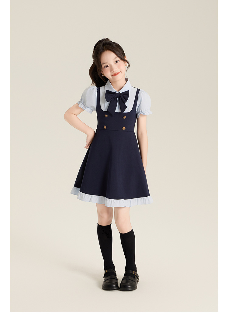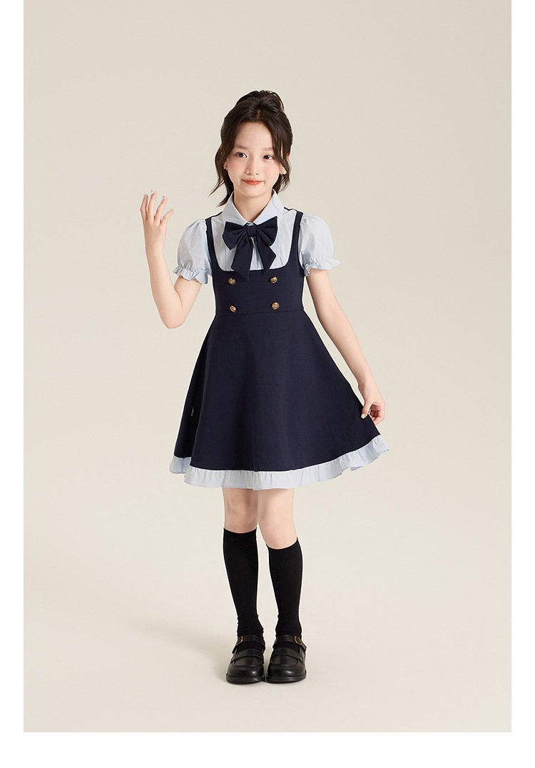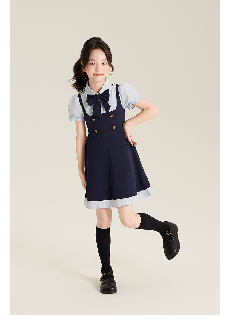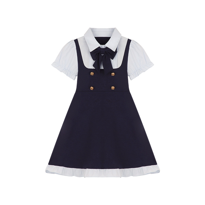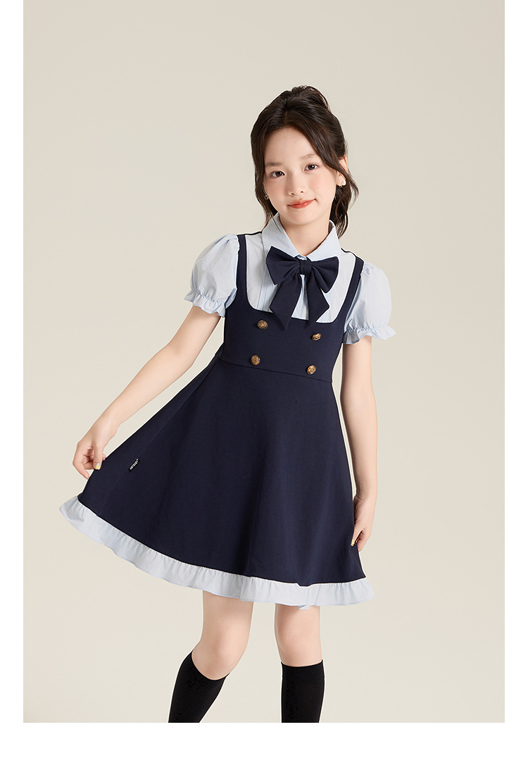 Amybaby 여자 스커트 여름 2025 새로운 대학 스타일 달콤한 가짜 투피스 보우 A 라인 드레스