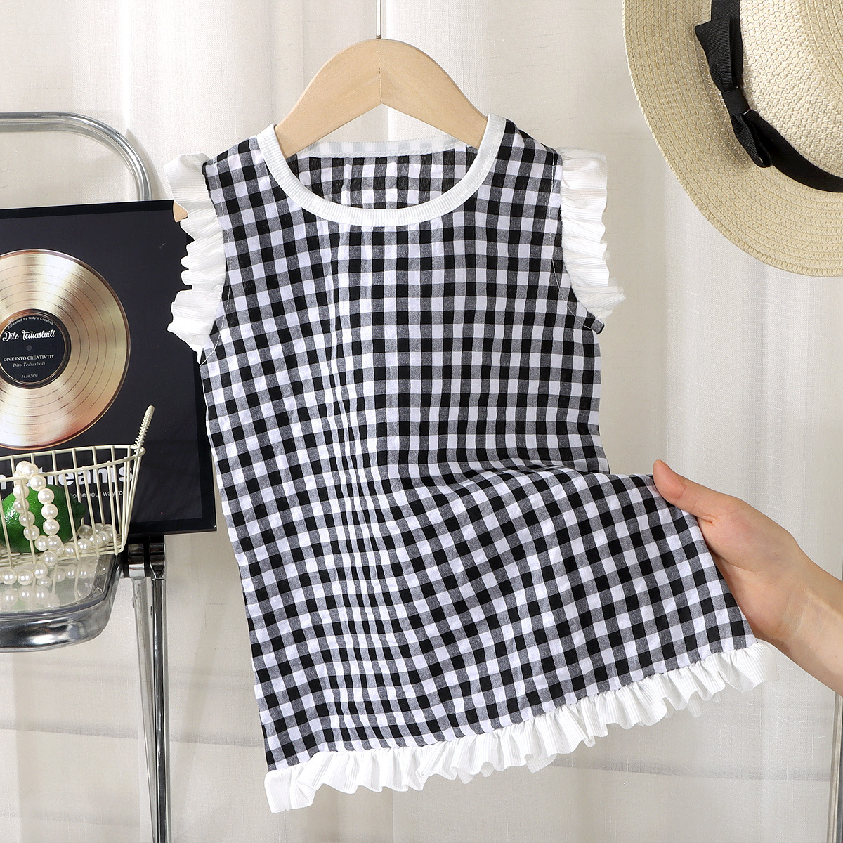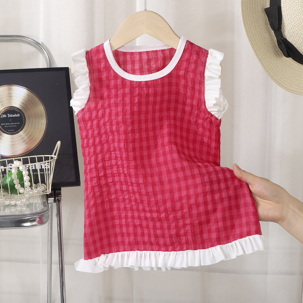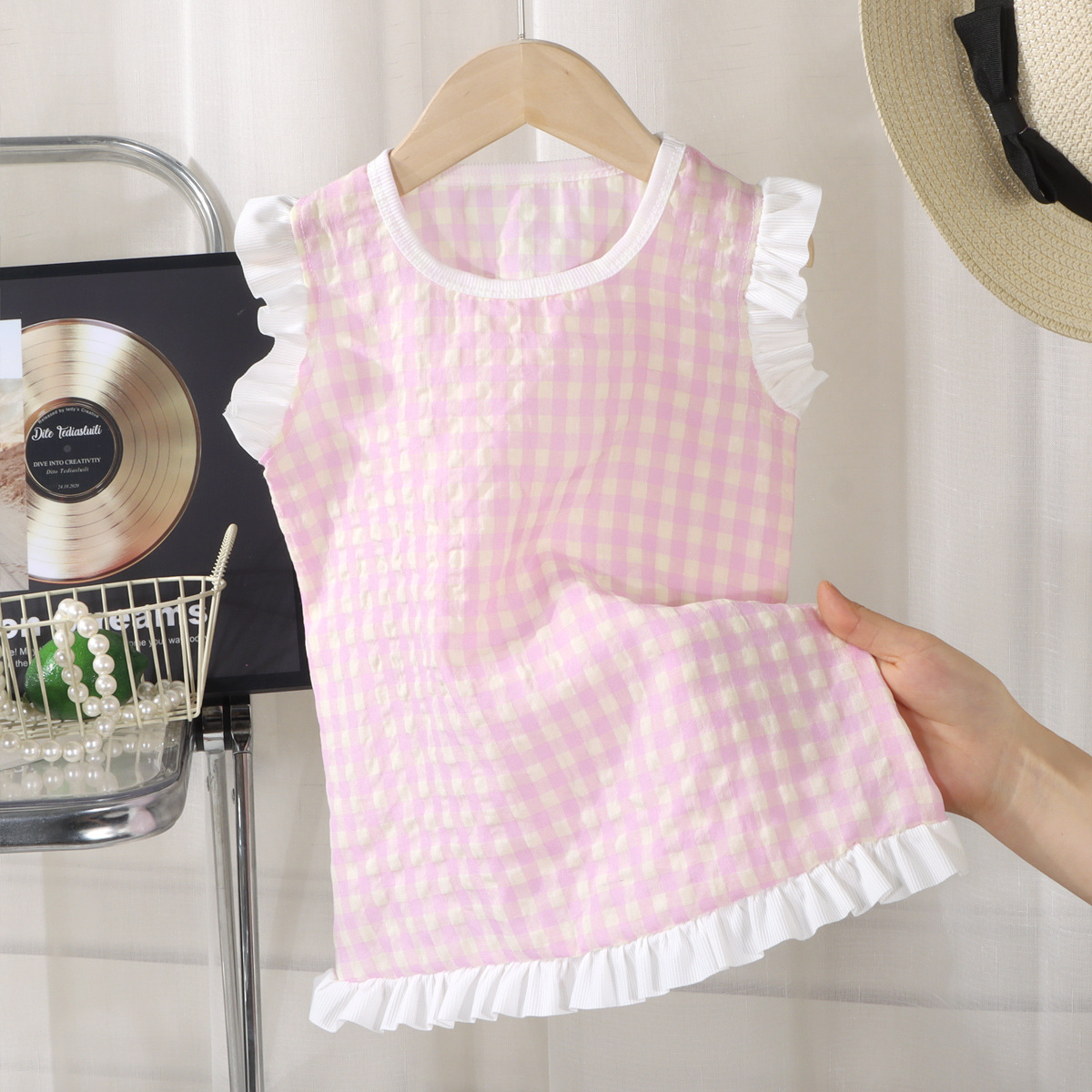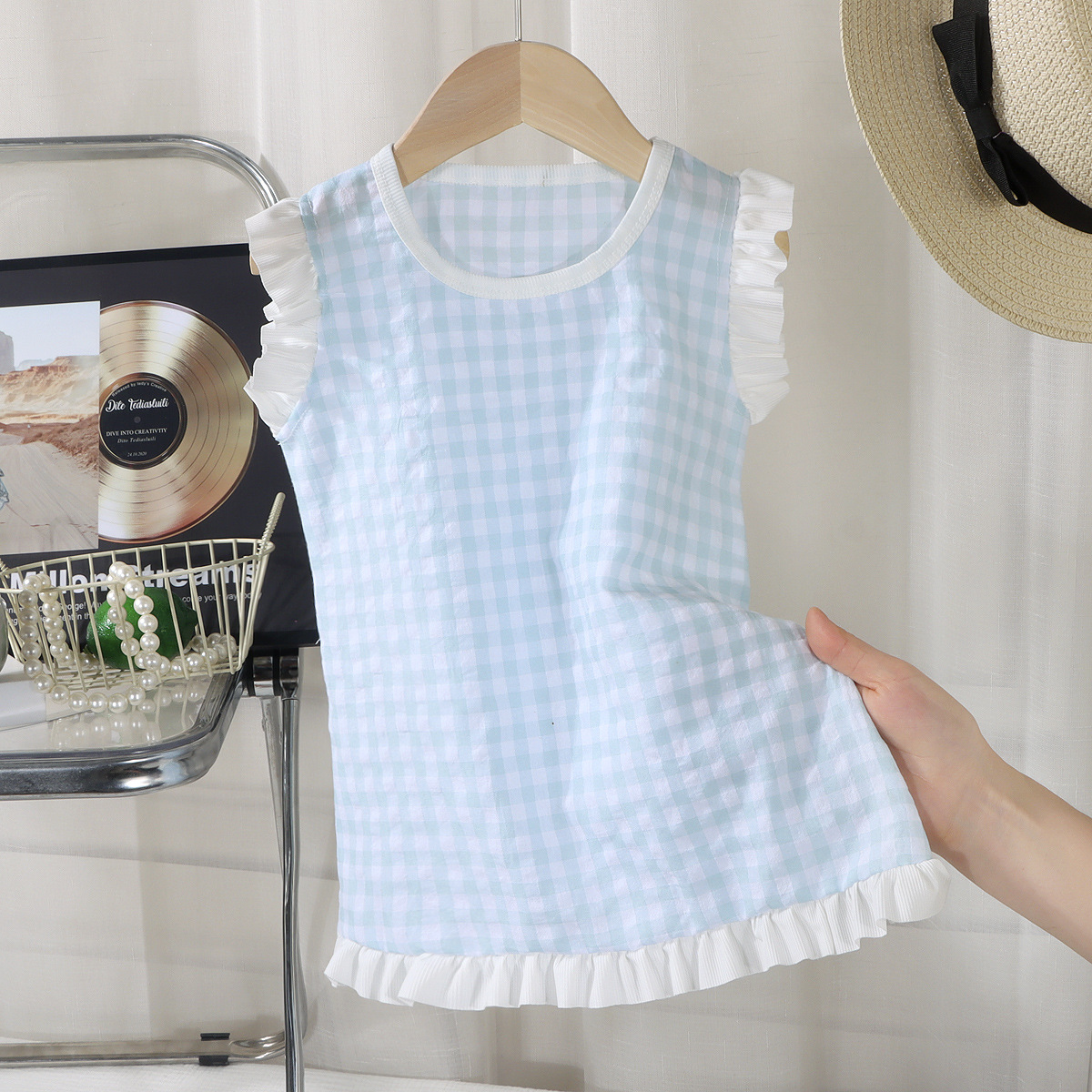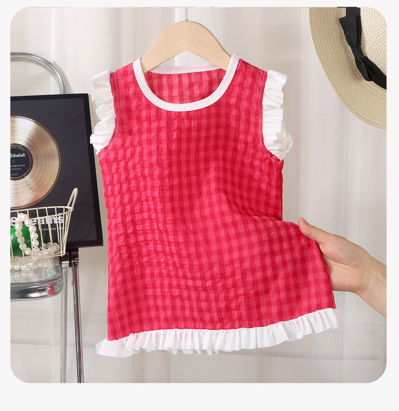 여아 레이스 원피스 여름 아기 플라잉 슬리브 체크무늬 조끼 원피스 어린 소녀 공주풍 원피스 유아용스토어 가기