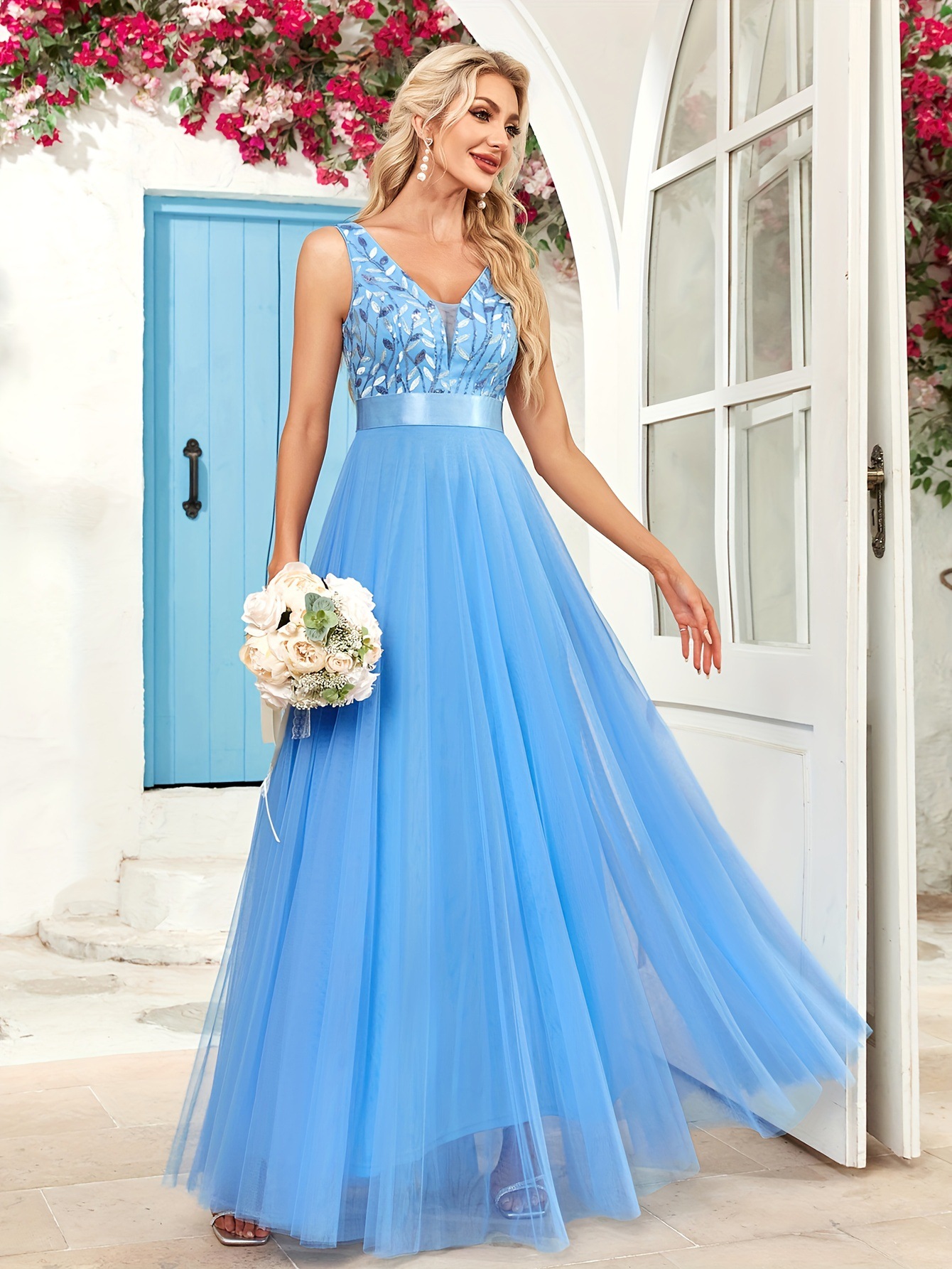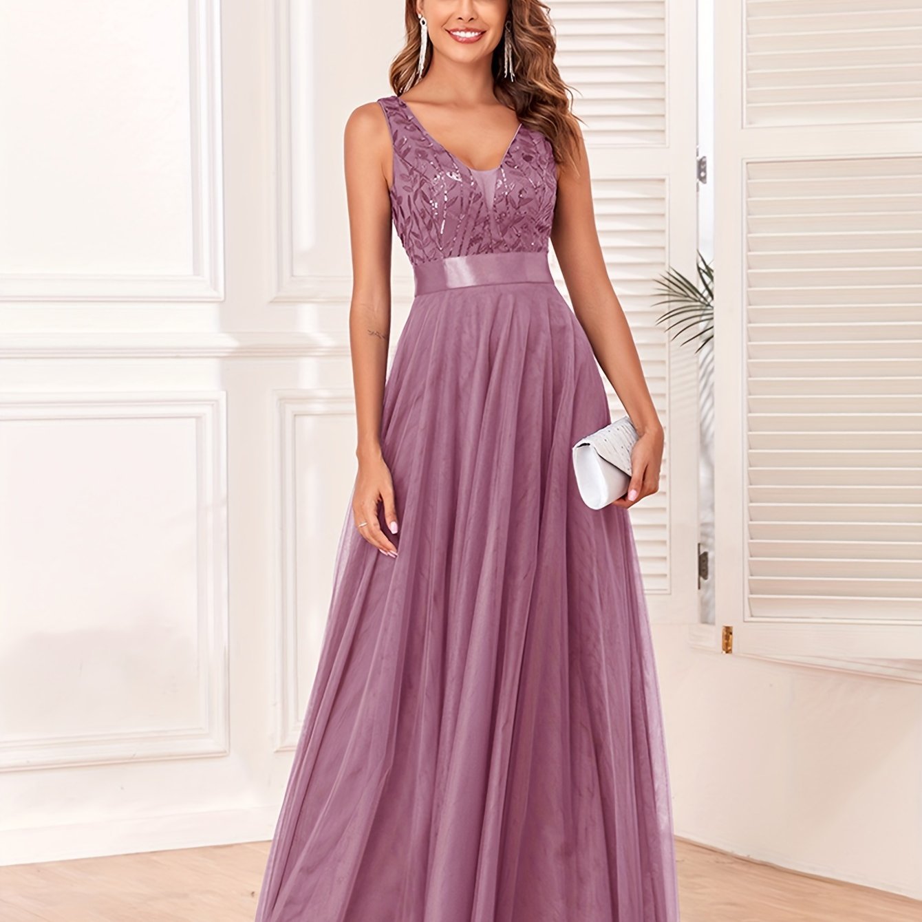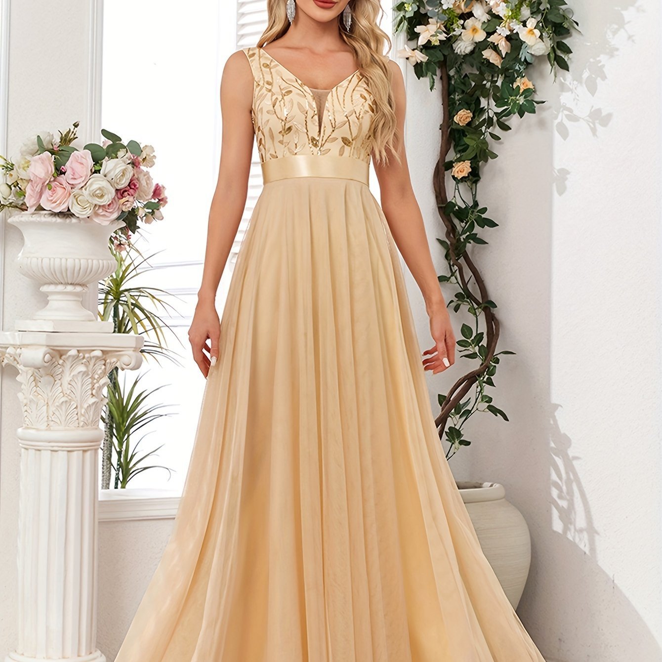 우아한 V 넥 스팽글 리프 패턴 슬리브 드레스 크로스보더스토어 가기