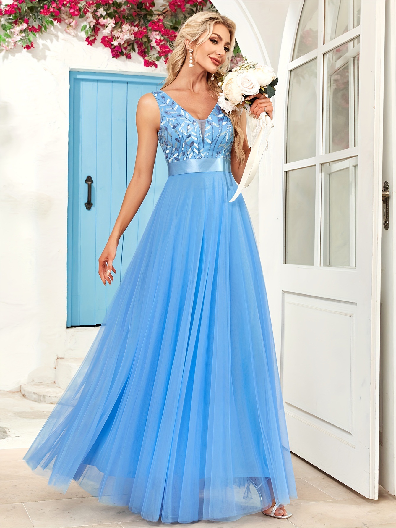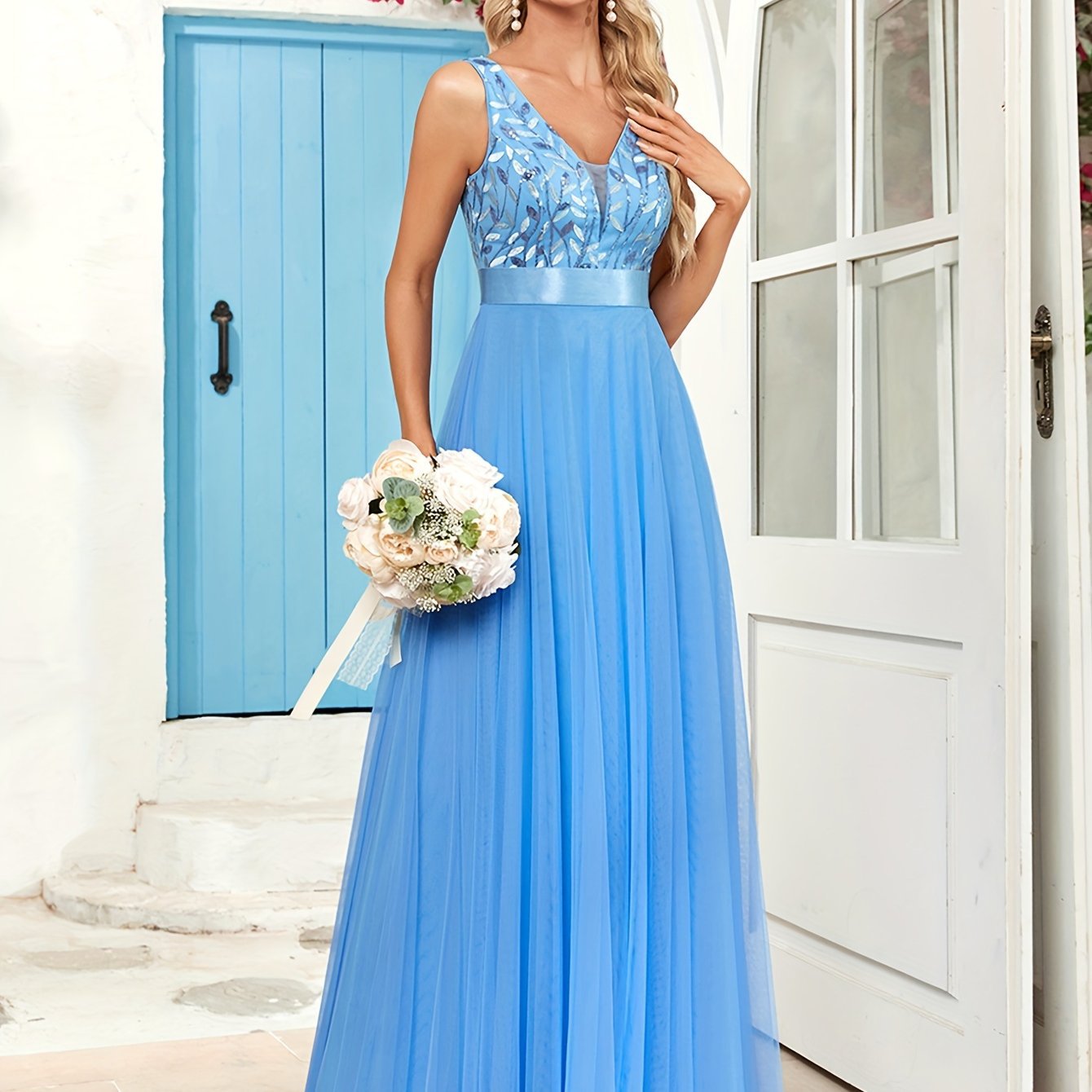 우아한 V 넥 스팽글 리프 패턴 슬리브 드레스 크로스보더