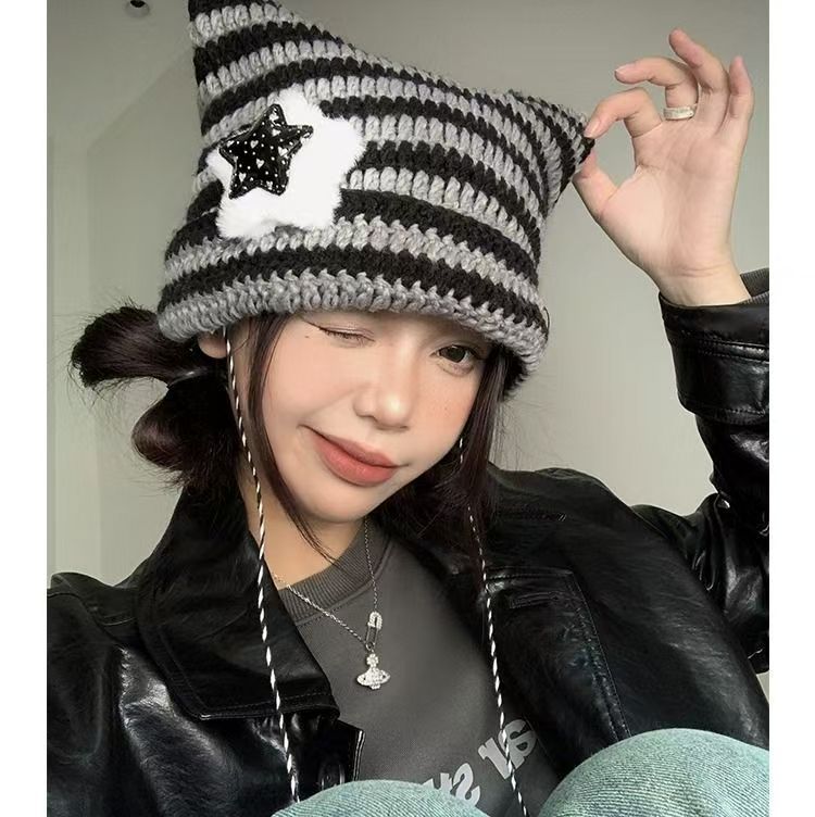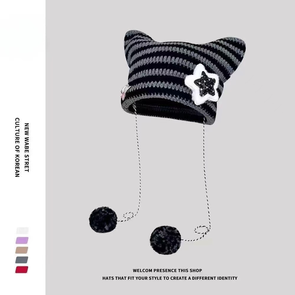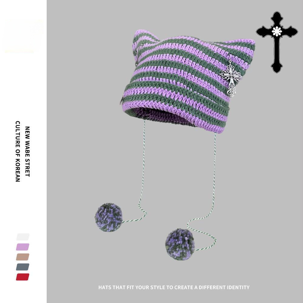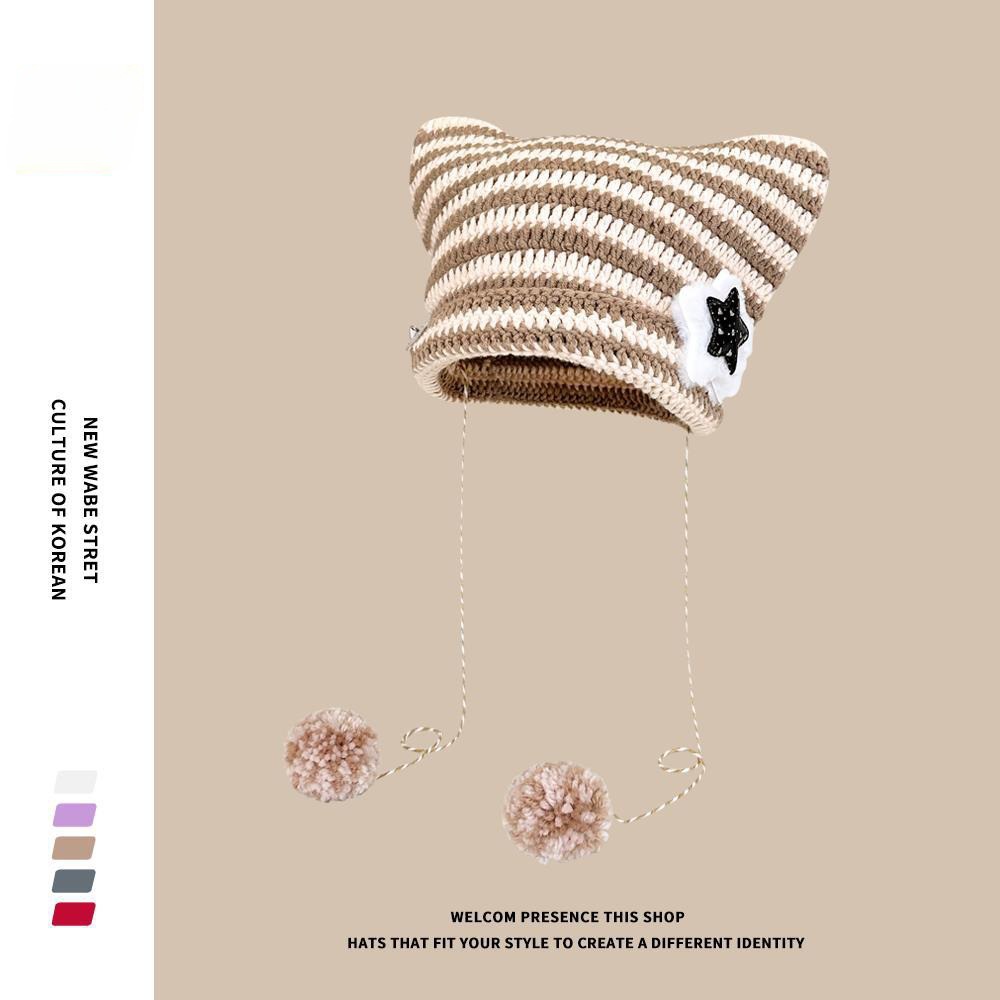 [공장 승인] 고양이 귀 니트 모자 여성 가을, 겨울 따뜻한 모직 모자 Yabi 스타일 스트라이프 풀오버 탈착식