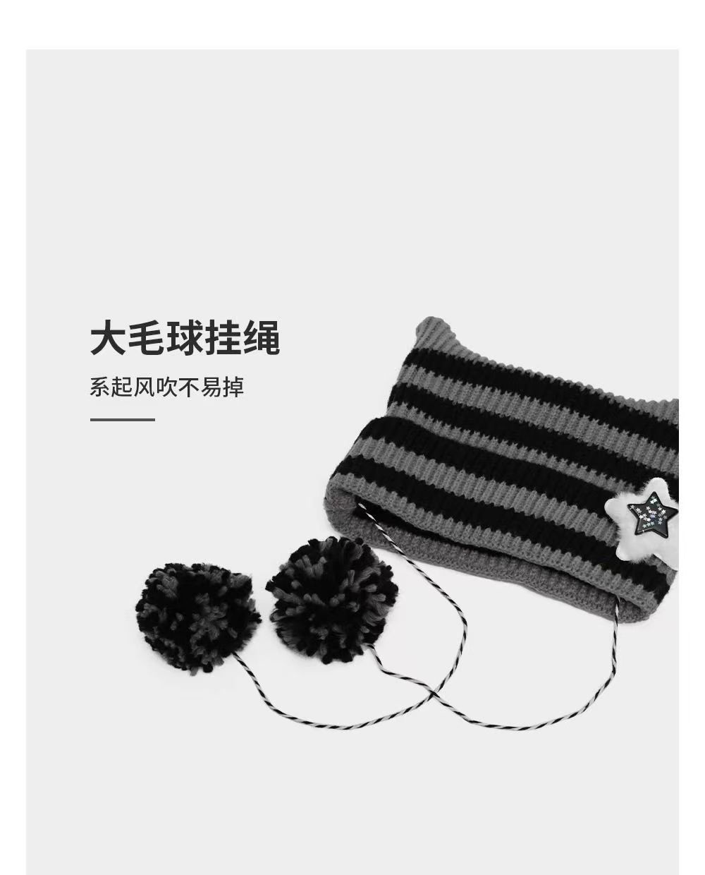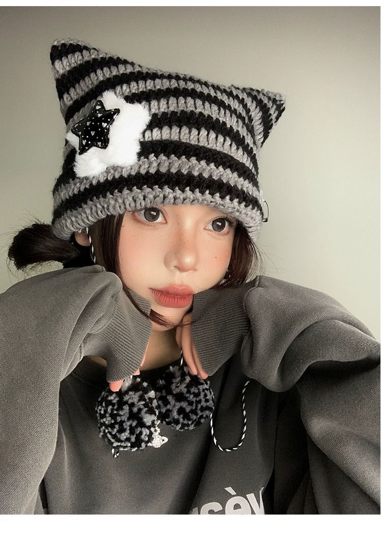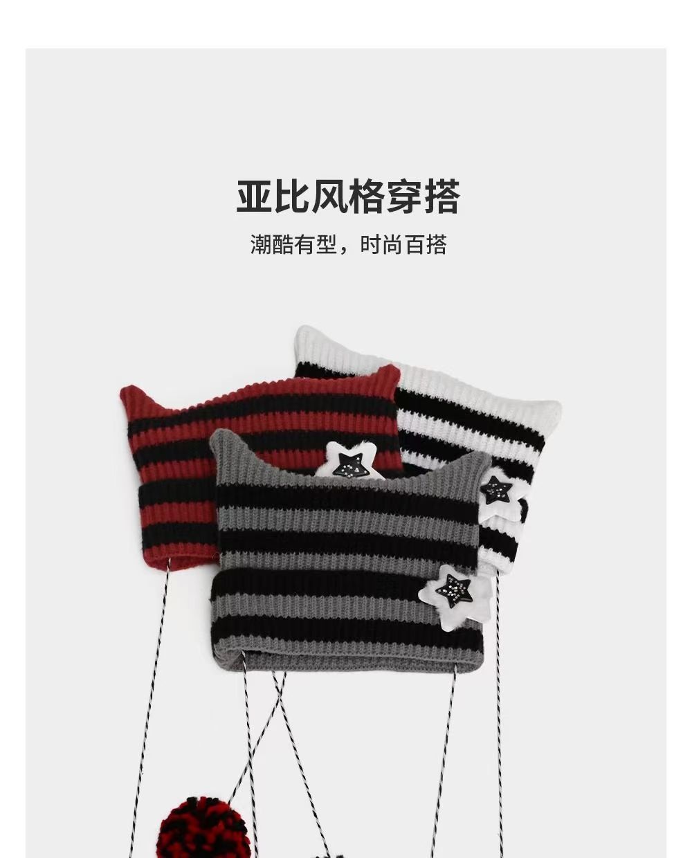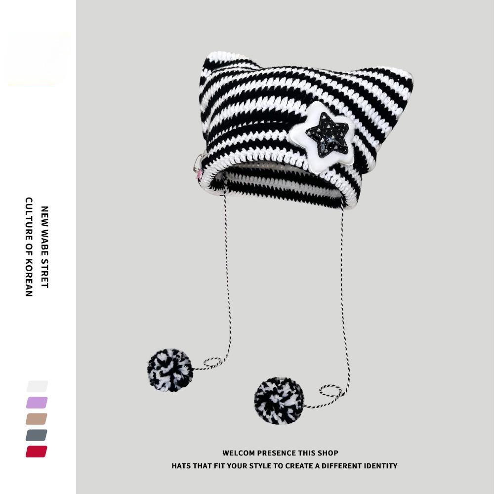 [공장 승인] 고양이 귀 니트 모자 여성 가을, 겨울 따뜻한 모직 모자 Yabi 스타일 스트라이프 풀오버 탈착식스토어 가기