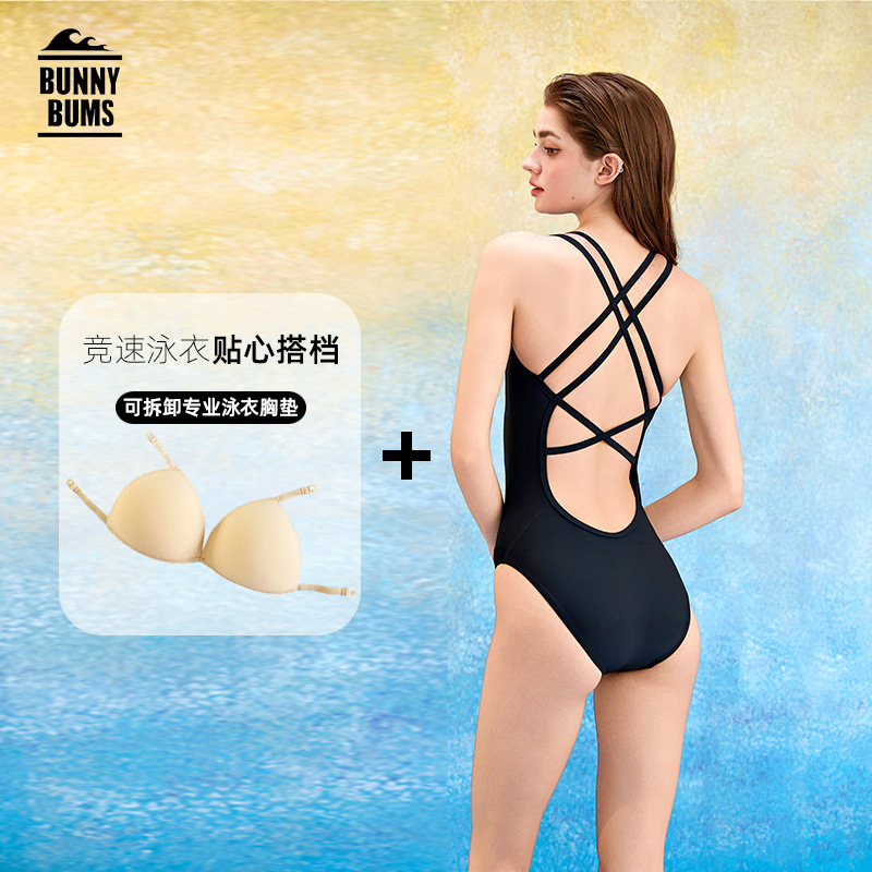 • 블랙 더블 숄더 스트랩 크로스 스타일 | 싱글 레이어 미드 포크 | 수영복 + 가슴 패드