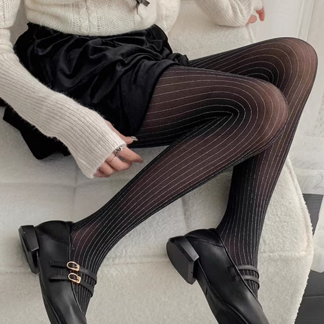 크로스보더 세로줄 은실 봄여름 럭셔리 버건디 블랙 스타킹 은실 세로줄 팬티스타킹 밝은 실크 내구성과 걸림 방지