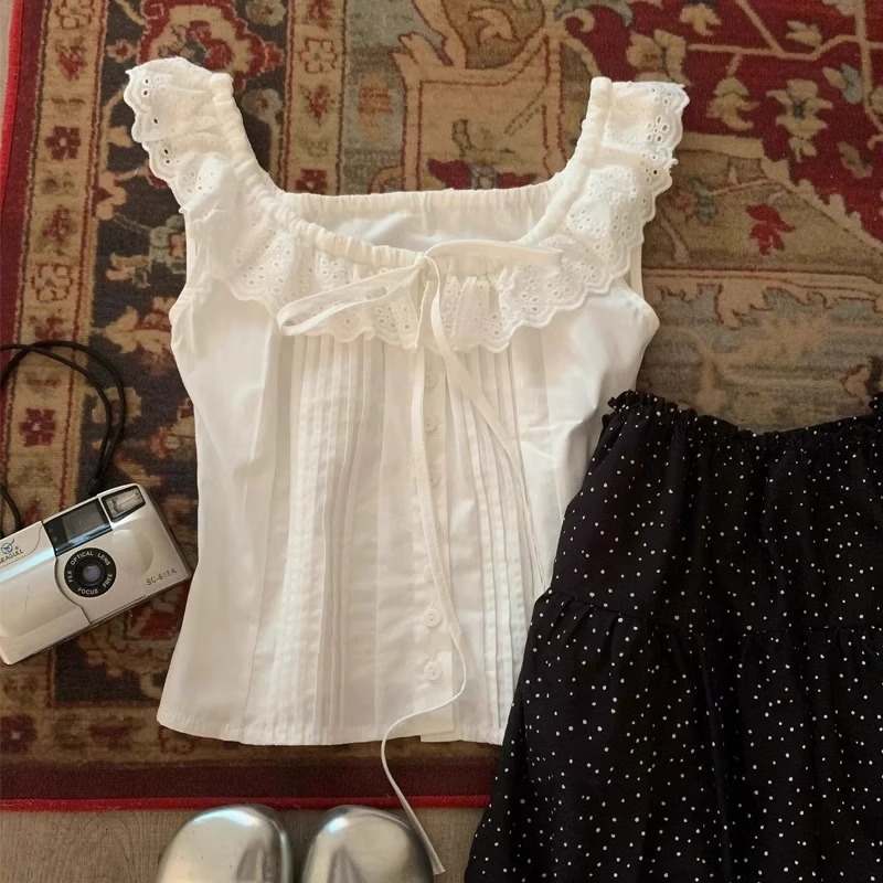 레이스 스퀘어넥 플리츠 화이트 셔츠 여성용 2026 여름 신상 디자인 유니크 민소매 베스트 탑스토어 가기