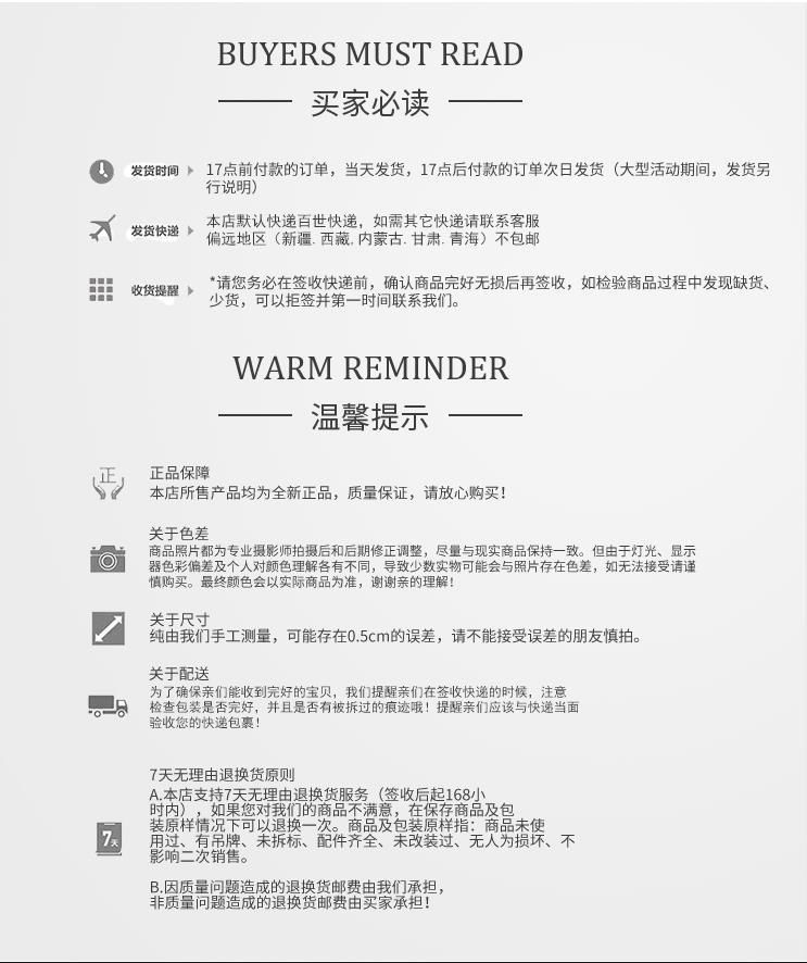 本店所有商品支持一件代发,商品混批,一件发货。放心购买,售后无忧。部分地区和单品价格低于10元的咨询客服运费及发货问题.否则由于运费问题的不予发货,运费异常的请联系客服修改。开票另加税点,可用对公账户付款,可开普票,增值税发票,公司票,个人票,收据,详细请咨询客服。收藏+加购物车=优先发货!