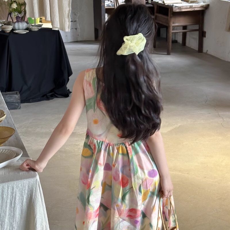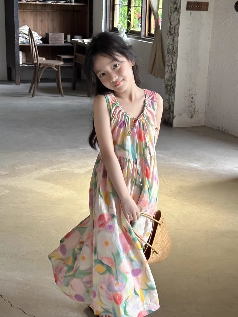 여자 서스펜더 스커트 여름 드레스 2025 새로운 어린이 여름 스타일 인터넷 연예인 드레스 큰 어린이 여성 비치 스커트