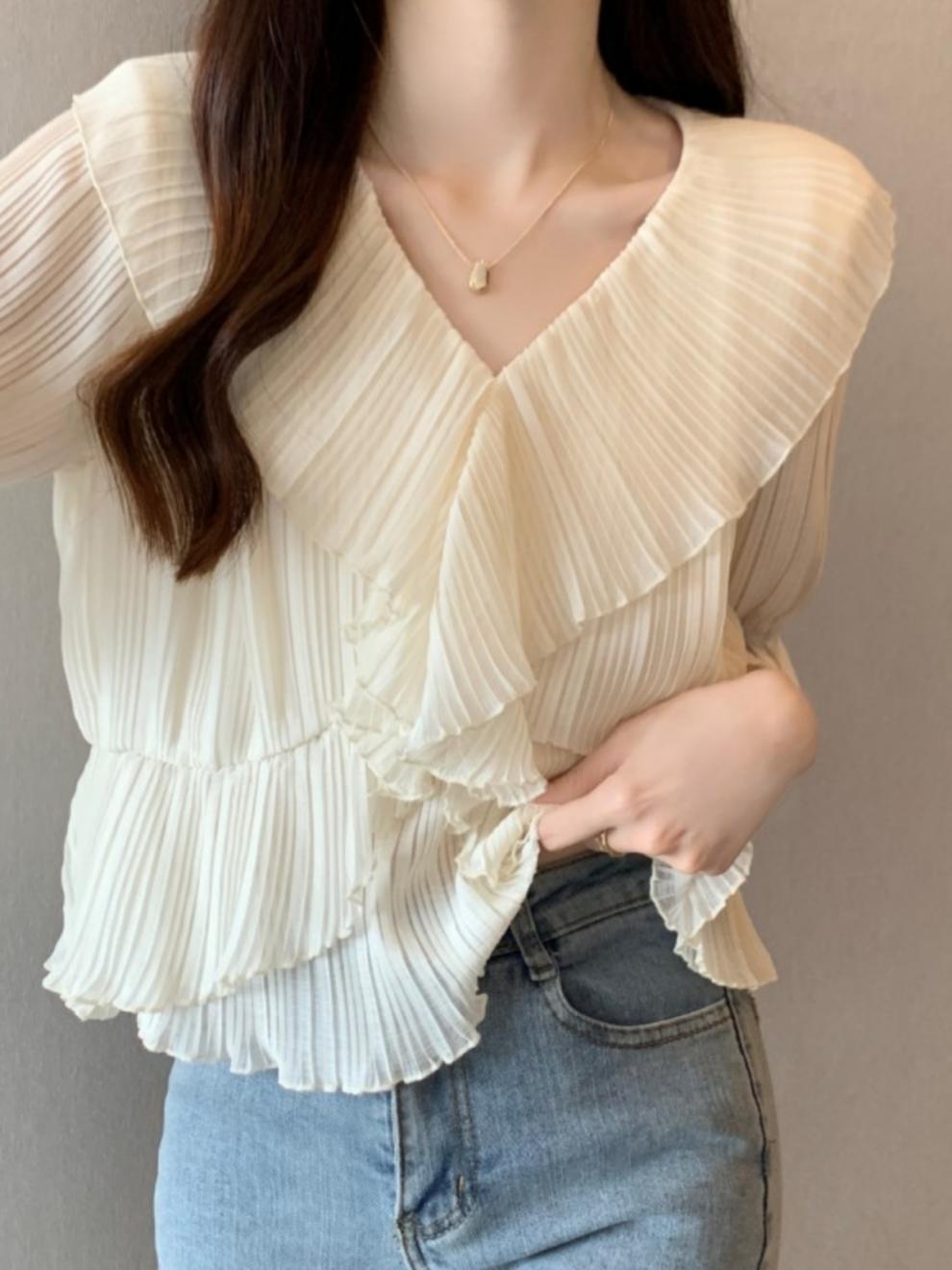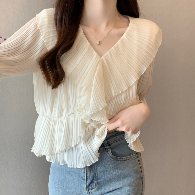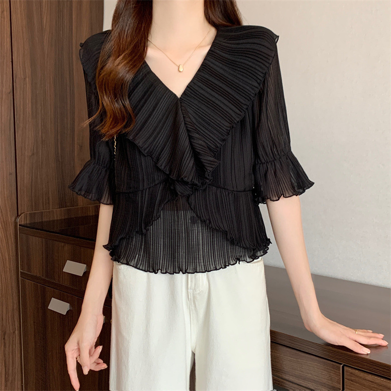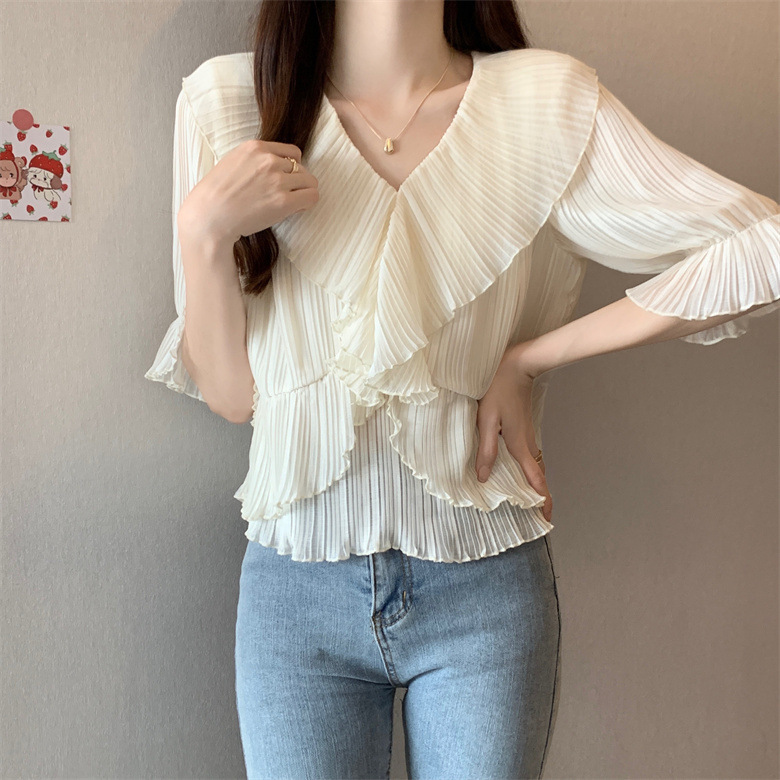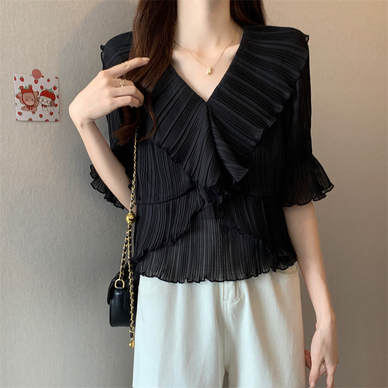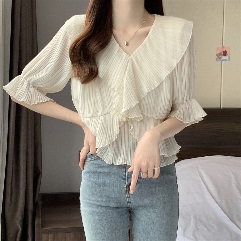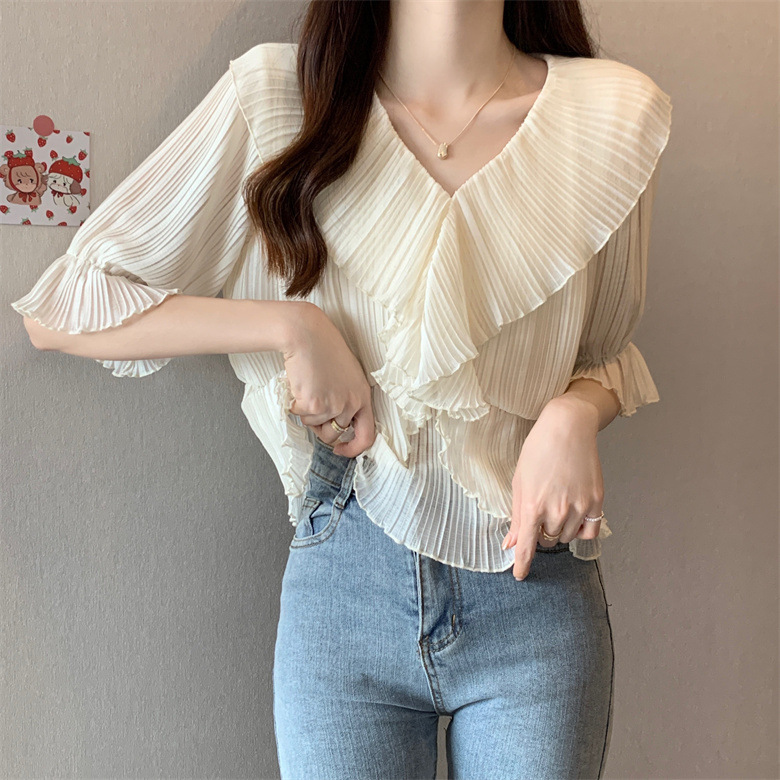플러스 사이즈 여성 의류 뚱뚱한 여름 새로운 프랑스 스타일 달콤한 프릴 칼라 벨 슬리브 쉬폰 셔츠 탑