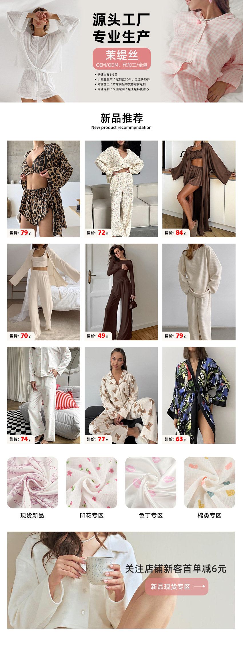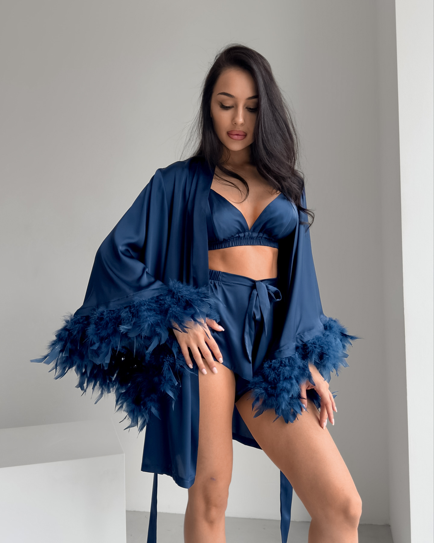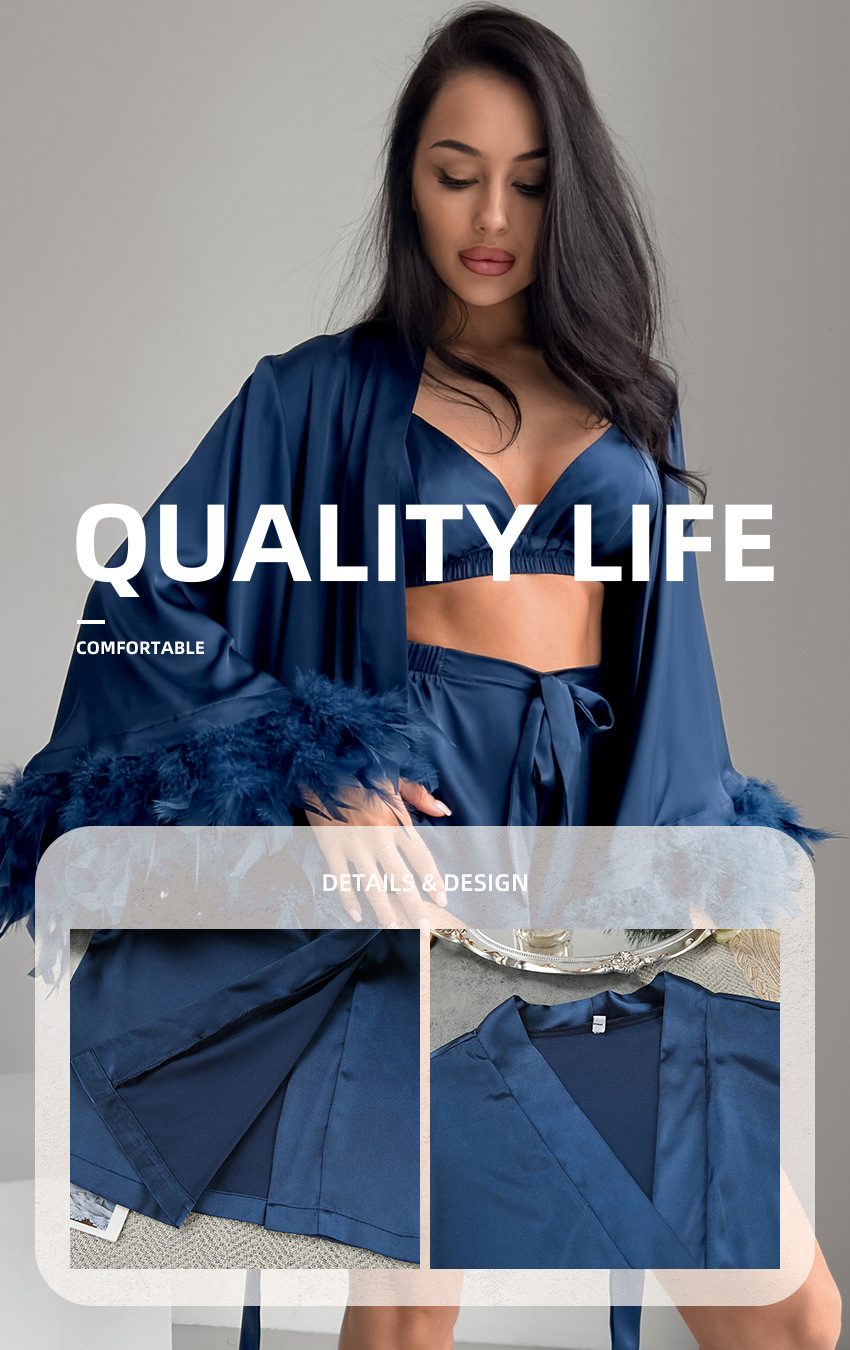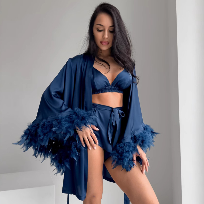 유럽과 미국의 국경 간 새로운 스타일 깃털 부드럽고 느슨한 모조 실크 잠옷 3 피스 세트 2025 가을 대외 무역 여성용 가정 의류스토어 가기