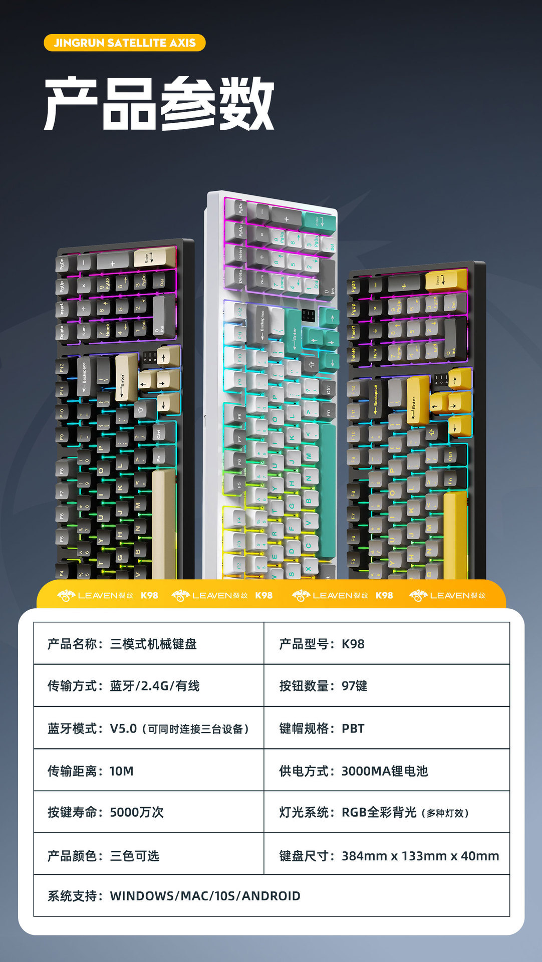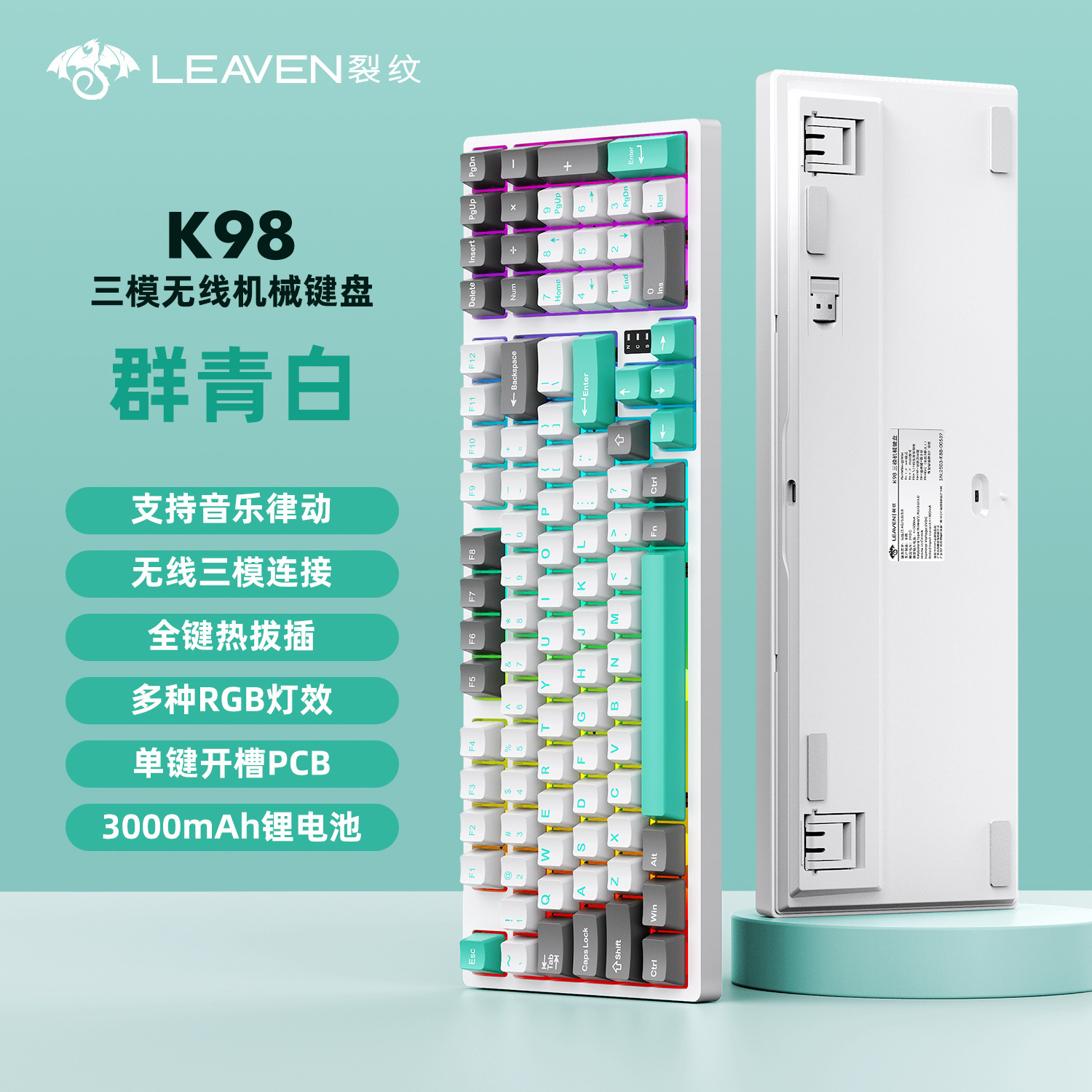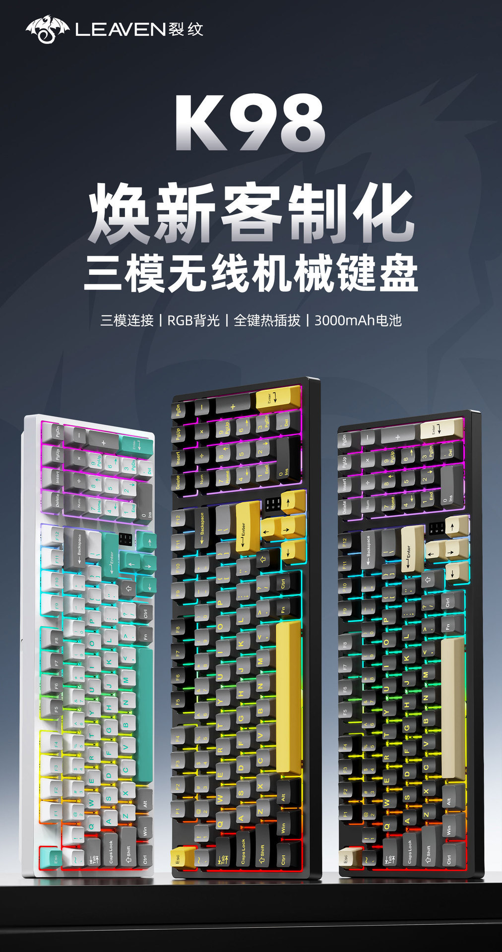 Crack K98 맞춤형 핫 스왑 가능 기계식 키보드 e-스포츠 오피스 게임 RGB 무선 Bluetooth 3 모드 키보드
