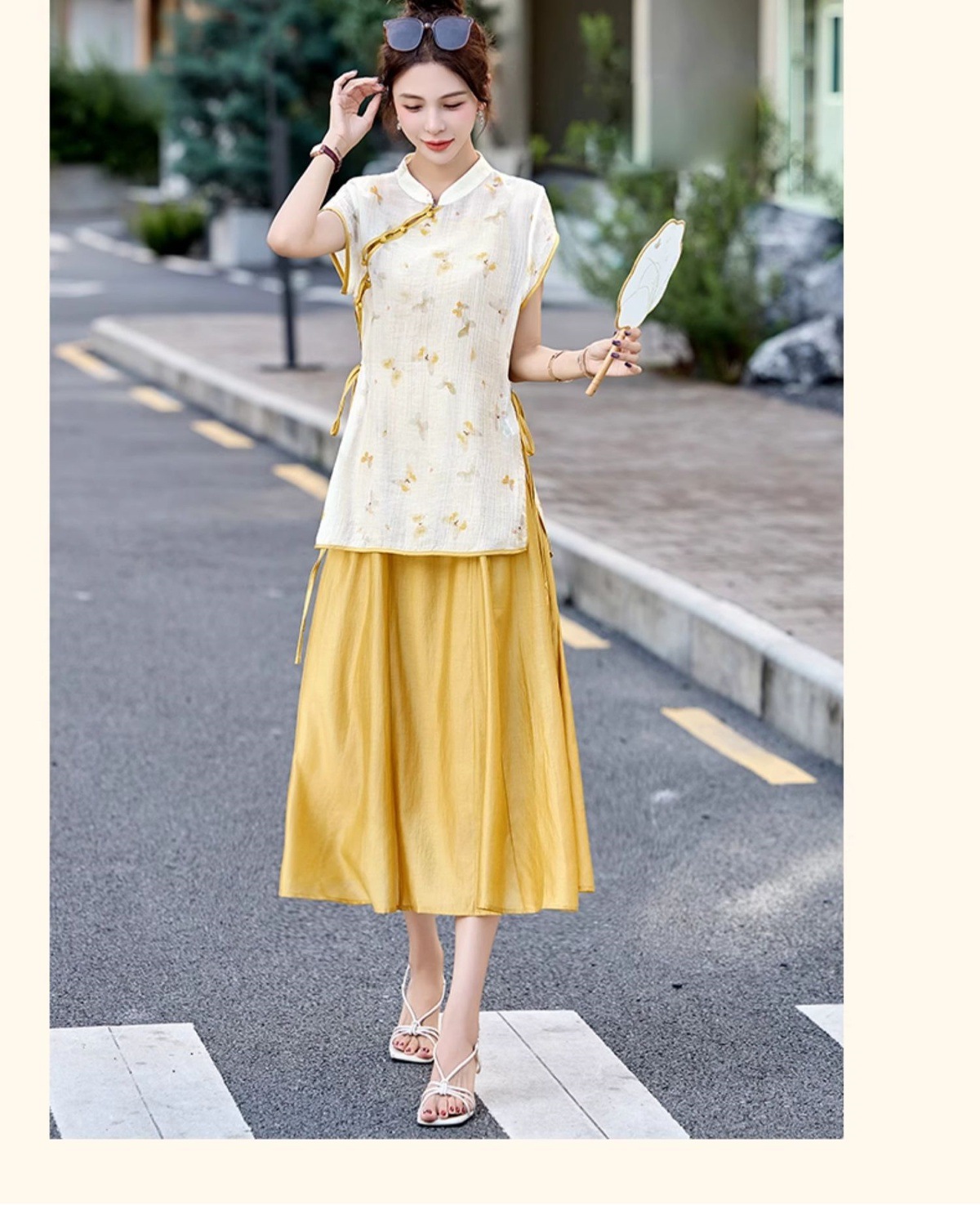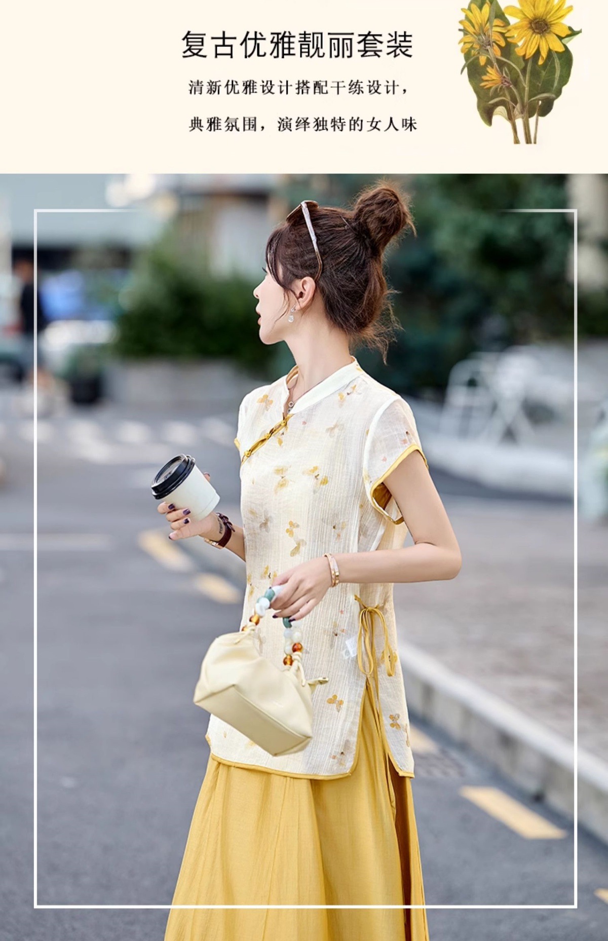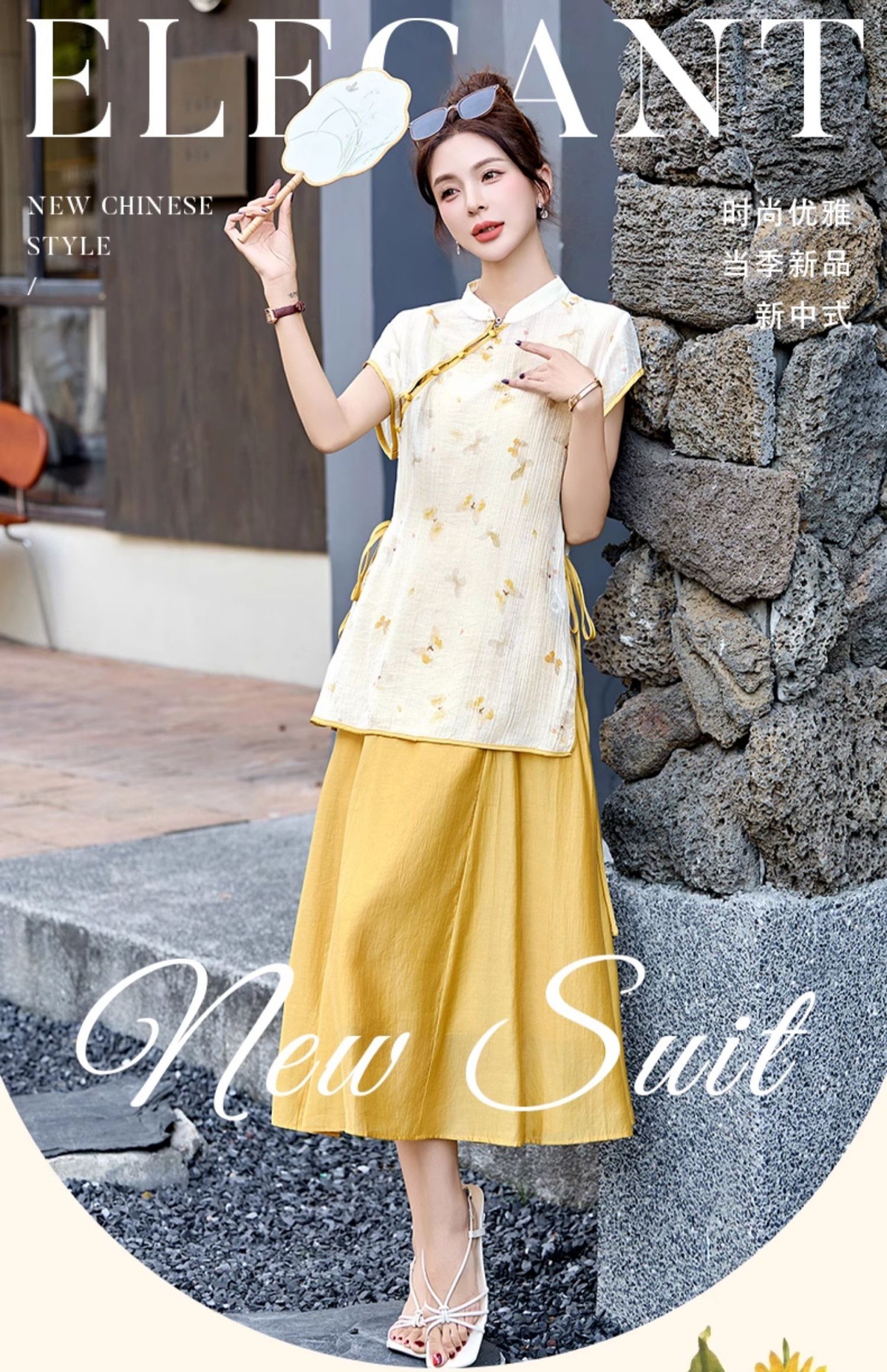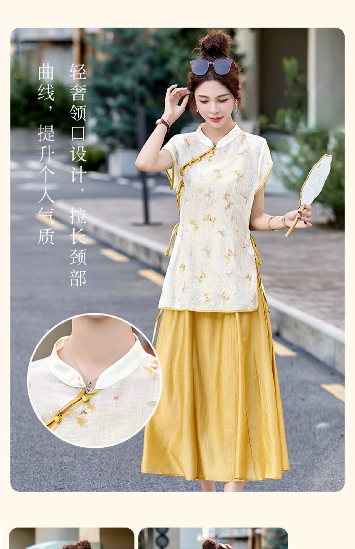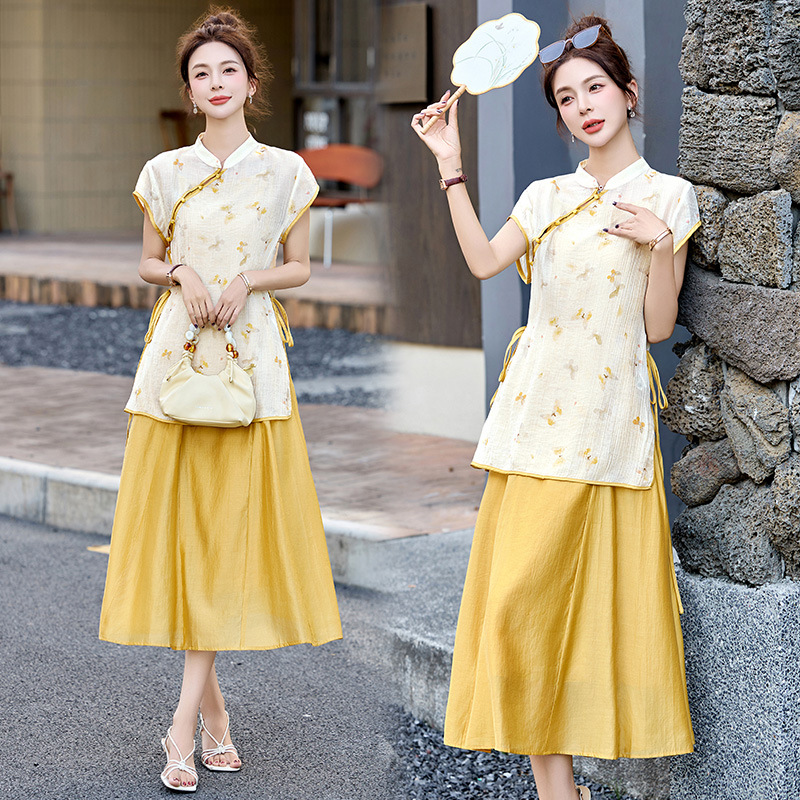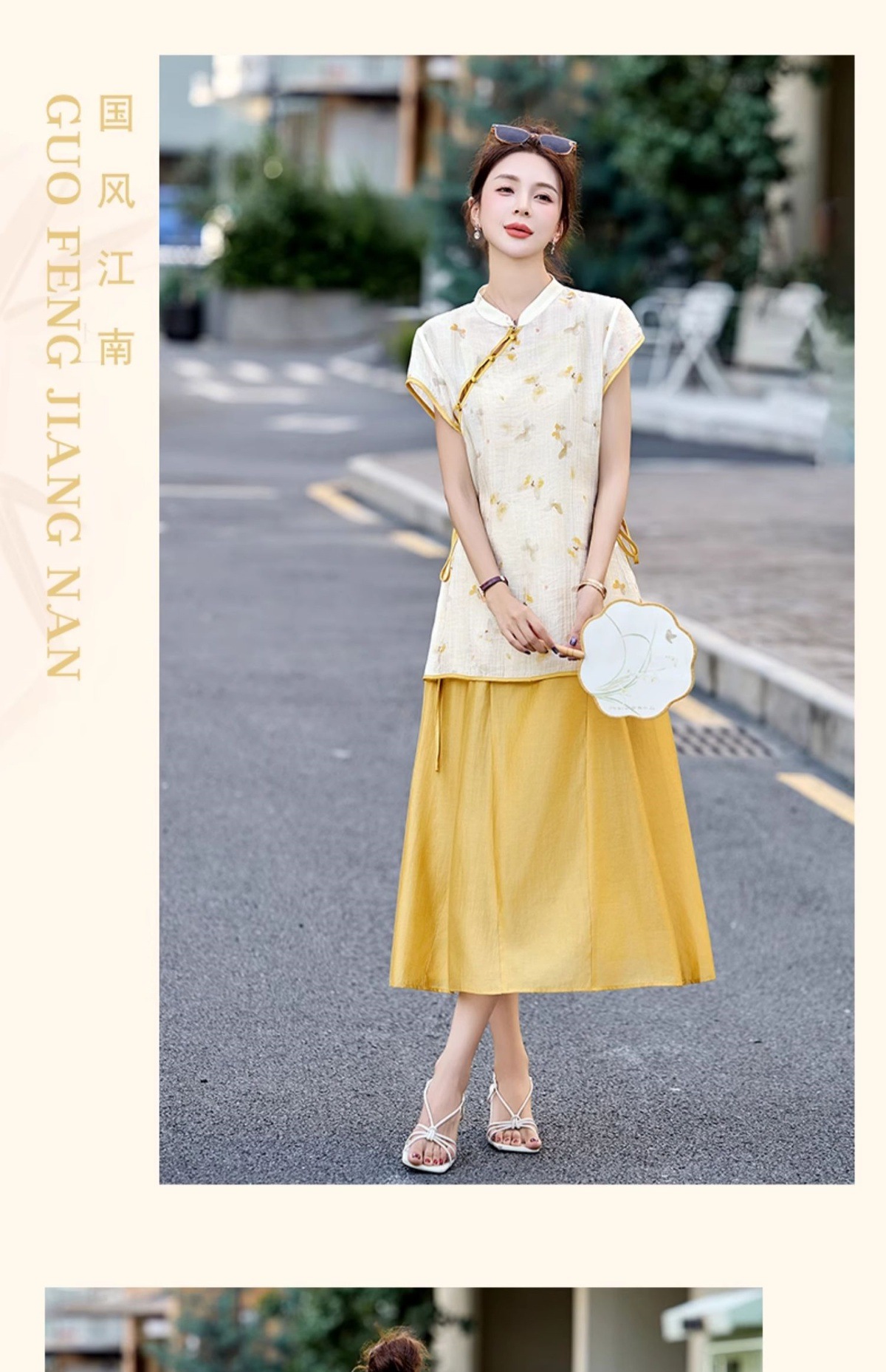 여성을위한 새로운 중국 스타일 중화民国 스타일 인쇄 개선 된 치파오 정장 2025 여름 새로운 기질 스커트 투피스 트렌디 세트