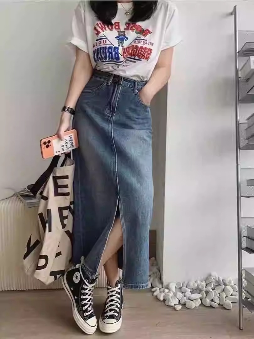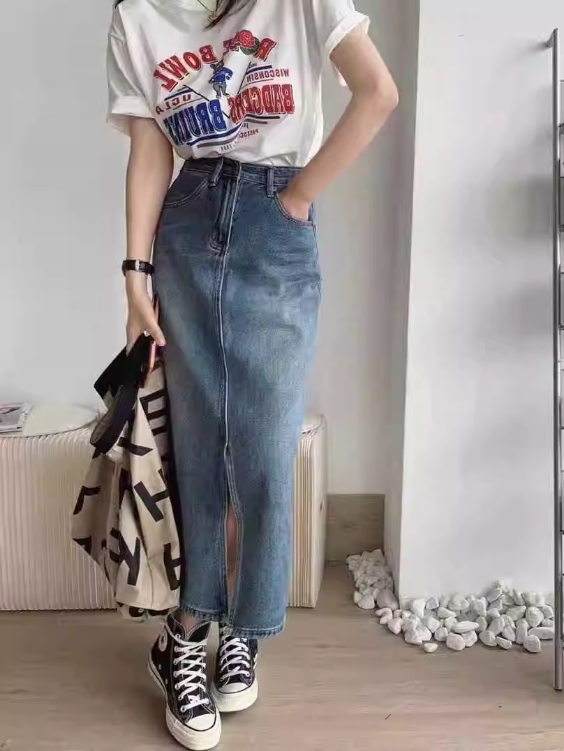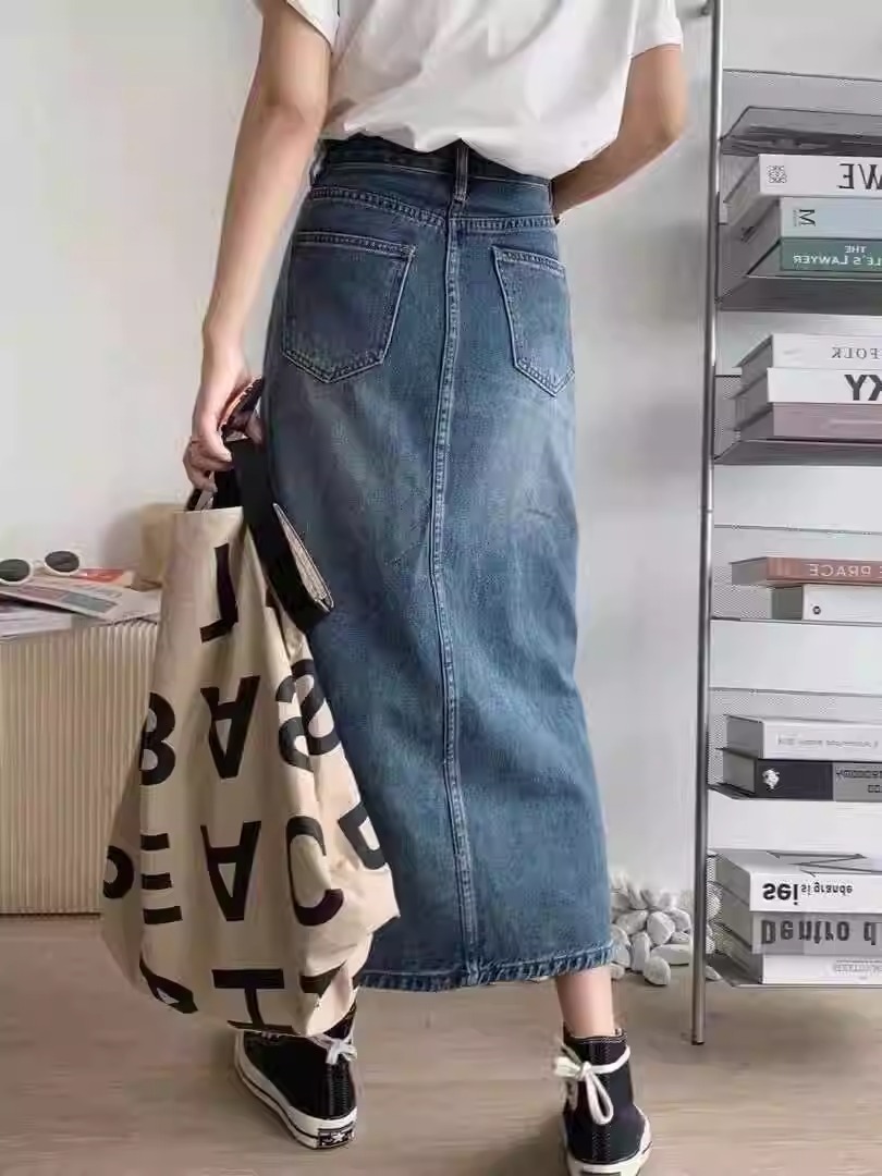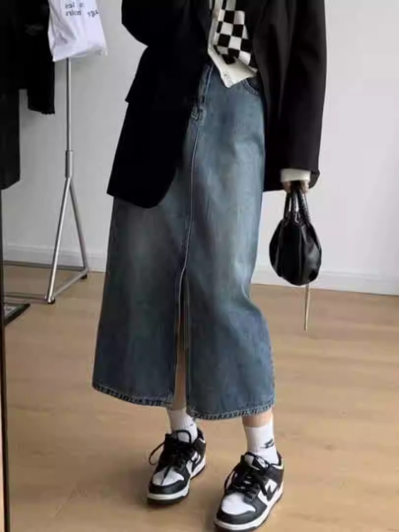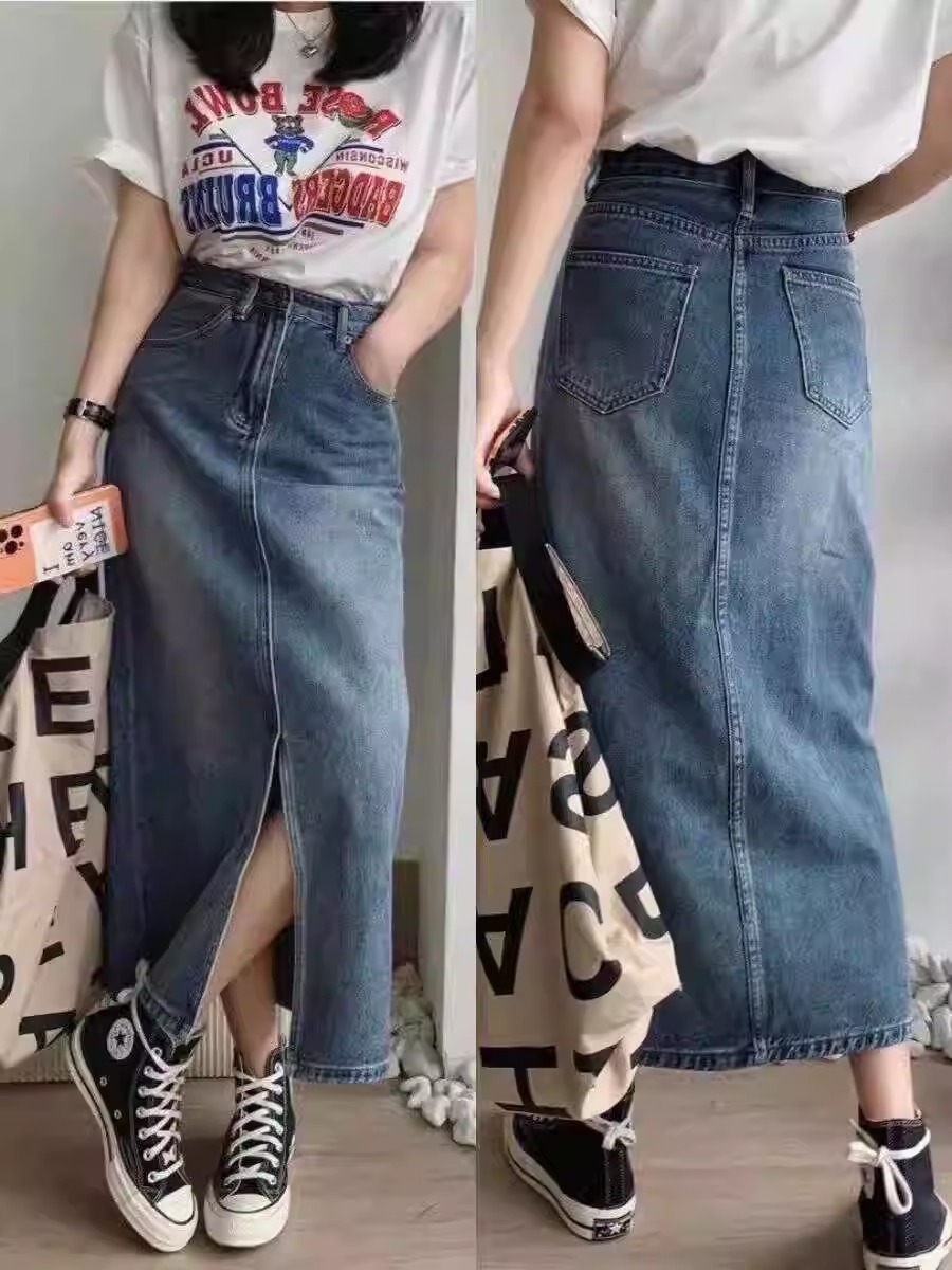여성용 하이웨이스트 슬릿 데님 스커트 2025 신작 여름 A라인 작은 엉덩이를 덮는 배형 몸매 롱 스커트스토어 가기