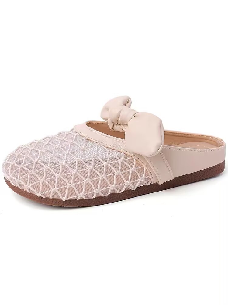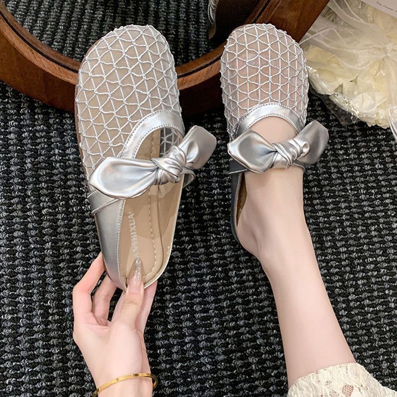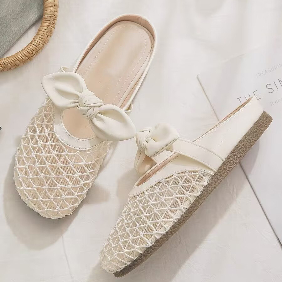 여성용 프렌치 우븐 중공 발가락 샌들, 2025 여름 스타일, 다용도 플랫 소프트 솔 메리 제인 하프 슬립 망사 슈즈스토어 가기