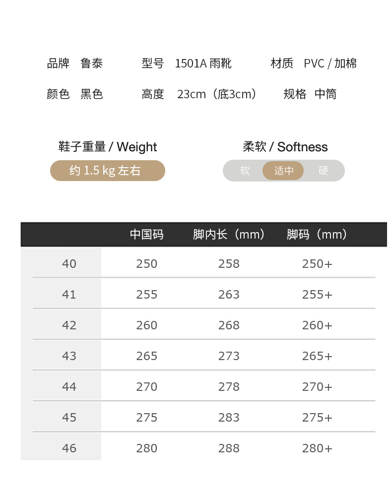 방수 및 미끄럼 방지 덧신, 두꺼운 워터슈즈 1501, 편안하고 내마모성이 뛰어난 건설현장 고무신, PVC 중통 노동보호 장화, 고무신