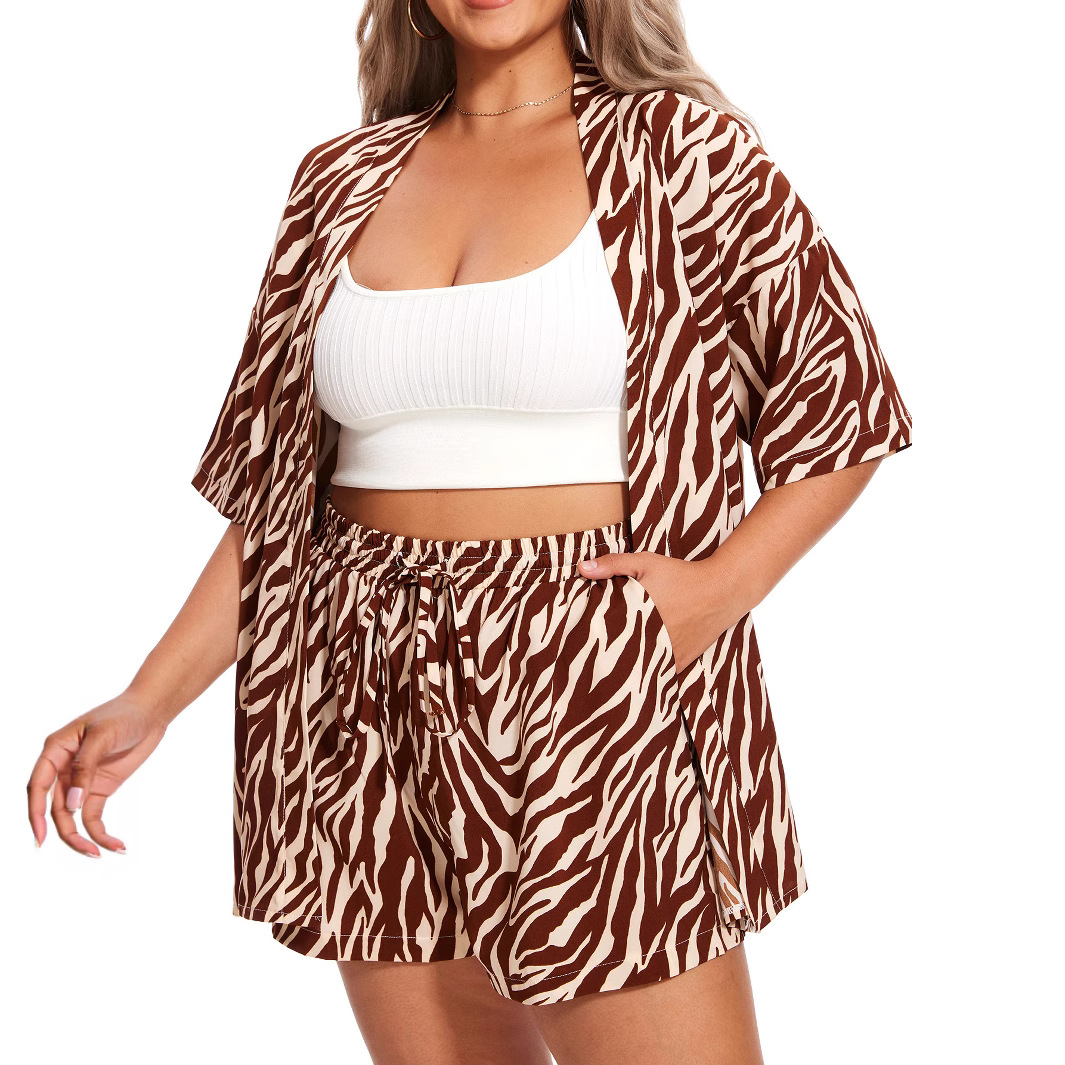 스팟 크로스보더 유럽 및 미국 여성용 레오파드 프린트 카디건 셔츠 루즈한 반바지 여름 플러스 사이즈 여성용 투피스 세트