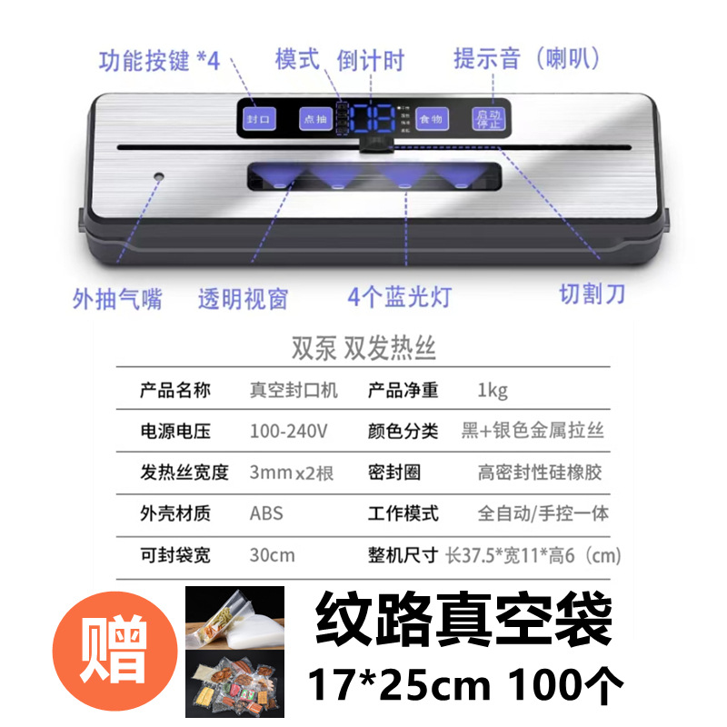• 이중 펌프 및 이중 밀봉 모델 + 진공 백 50개(17*25cm) 외부 펌핑 튜브 + 스폰지 스트립 포함