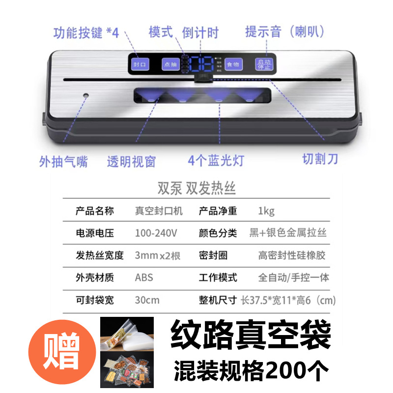 • 이중 펌프 및 이중 밀봉 모델 + 진공 백 200개(17*25/20*30/25*35/30*40cm 각 50개), 외부 펌핑 튜브 + 바다 포함