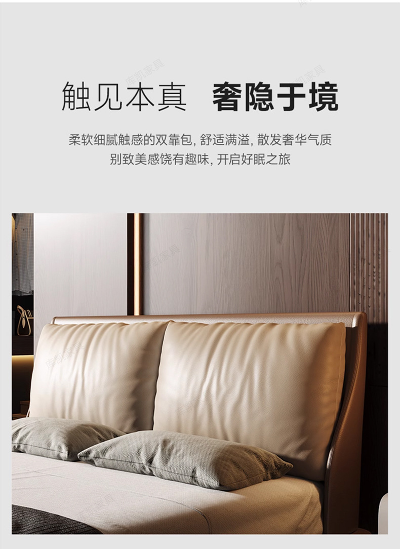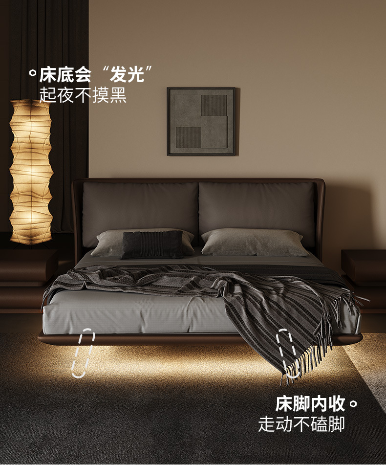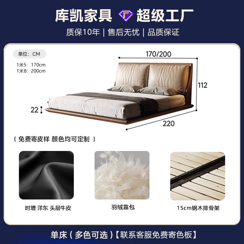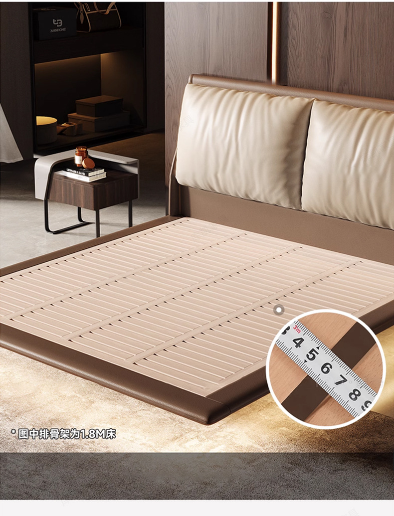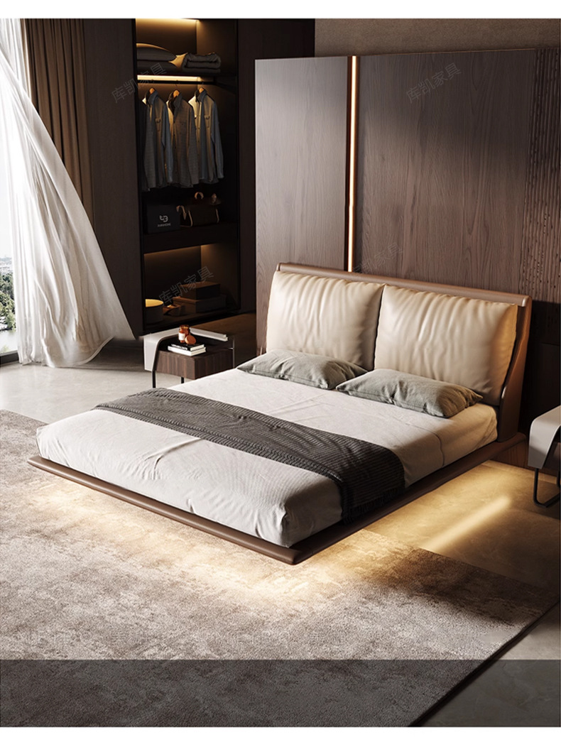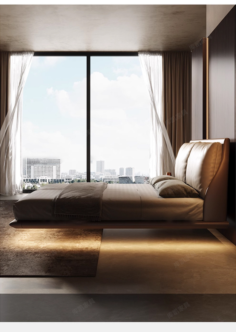 KuKai 이탈리아 미니멀리스트 1층 소가죽 침대 침실 홈 서스펜션 더블 소프트 가죽 아트 웨딩 침대 조명 포함