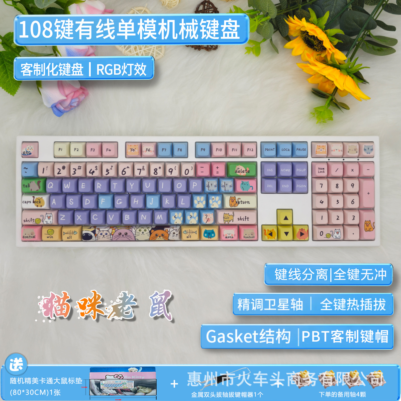 • 108 키 흰색 + 고양이 및 마우스 핑크 샤프트 유선 丨 키 풀러 및 샤프트 풀러 포함