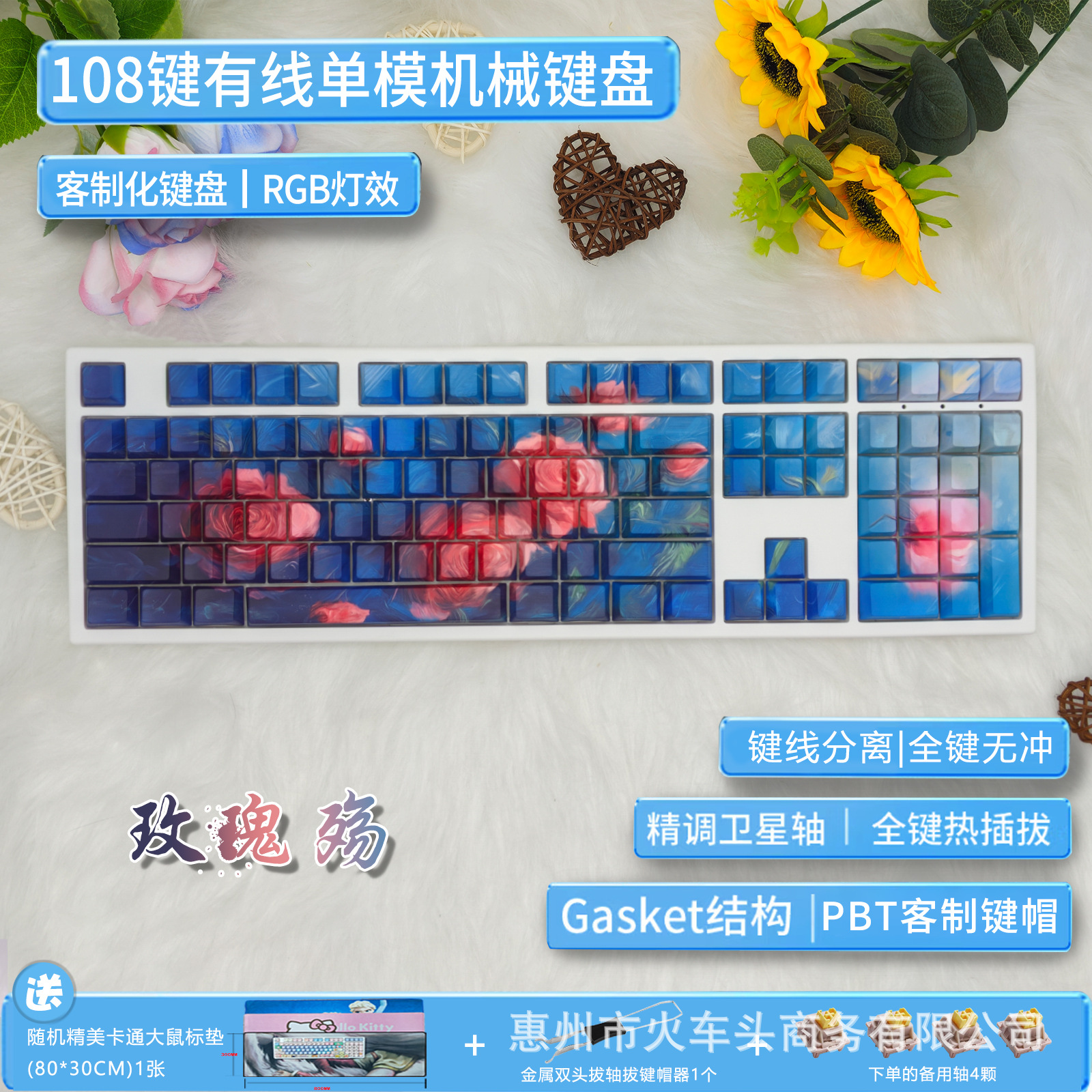 • 108 키 화이트 + 헬로키티 핑크 샤프트 유선丨키 풀러 및 샤프트 풀러 포함
