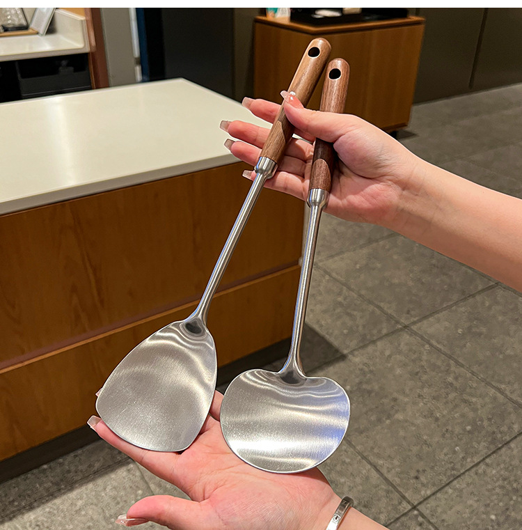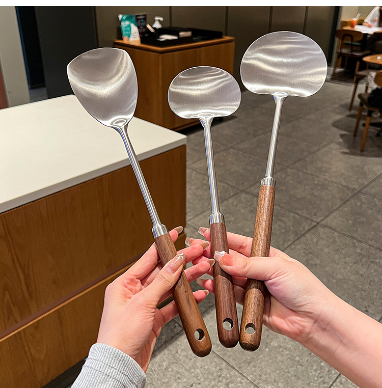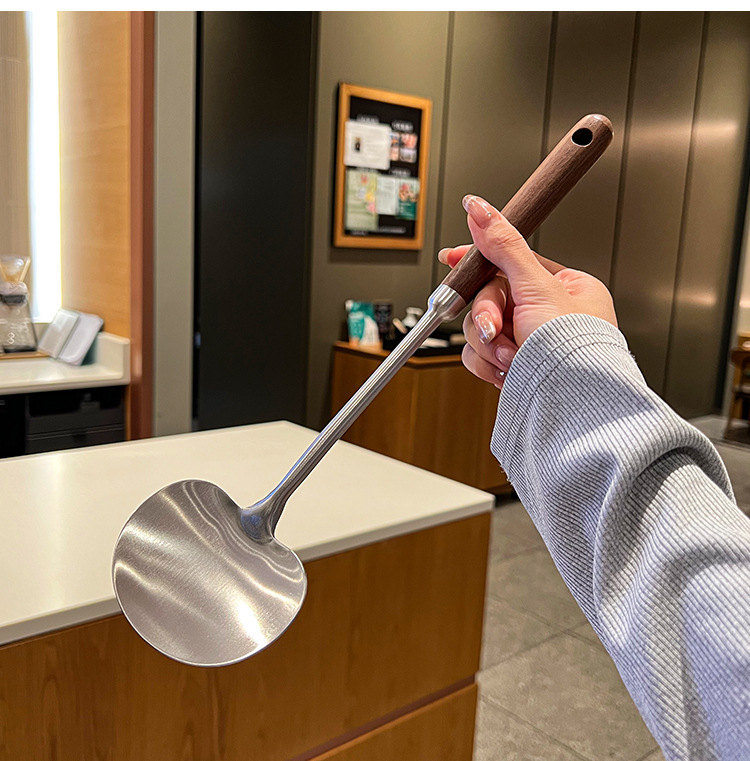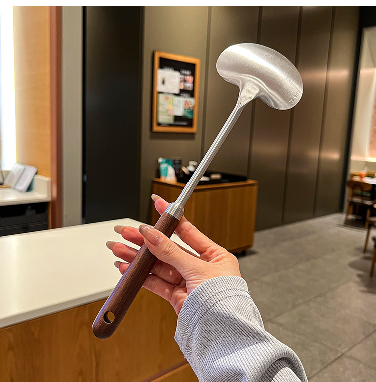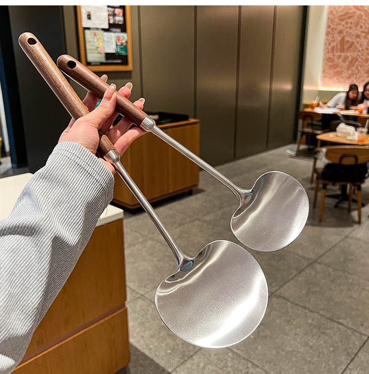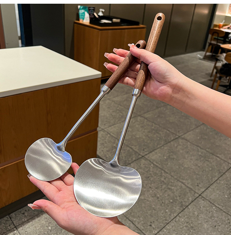 316 등급 스테인레스 스틸 호두 주걱 수프 쉘 나무 손잡이 둥근 머리 주걱 요리 냄비 주방 버섯 작은 프라이팬 주걱