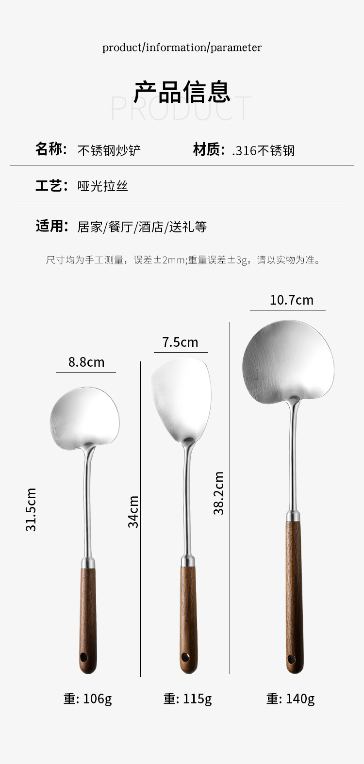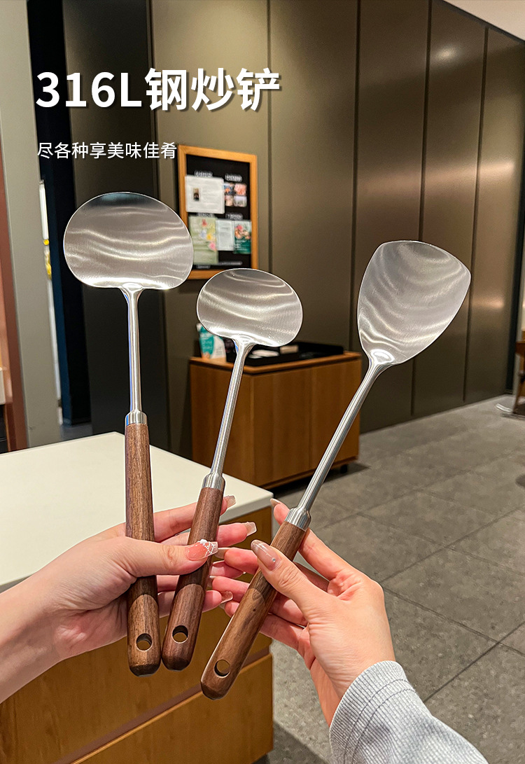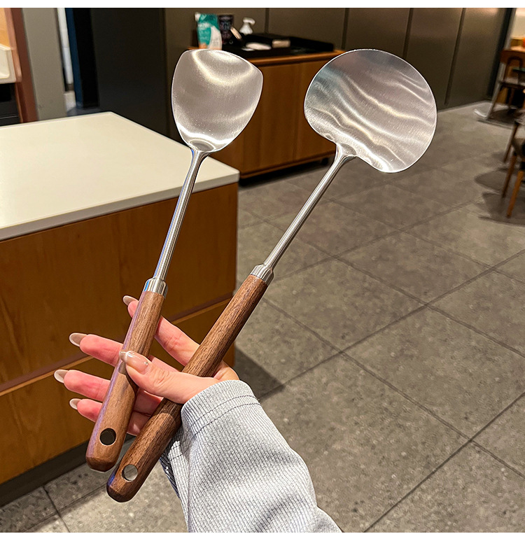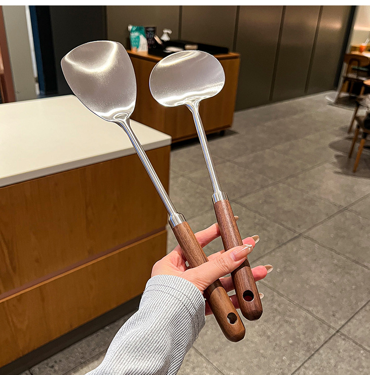 316 등급 스테인레스 스틸 호두 주걱 수프 쉘 나무 손잡이 둥근 머리 주걱 요리 냄비 주방 버섯 작은 프라이팬 주걱