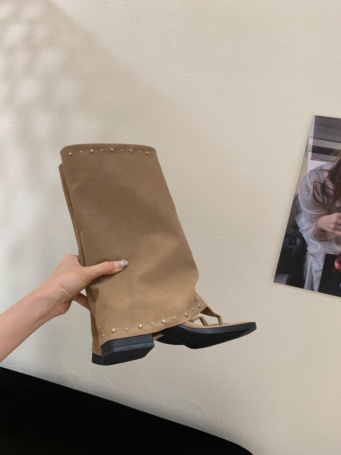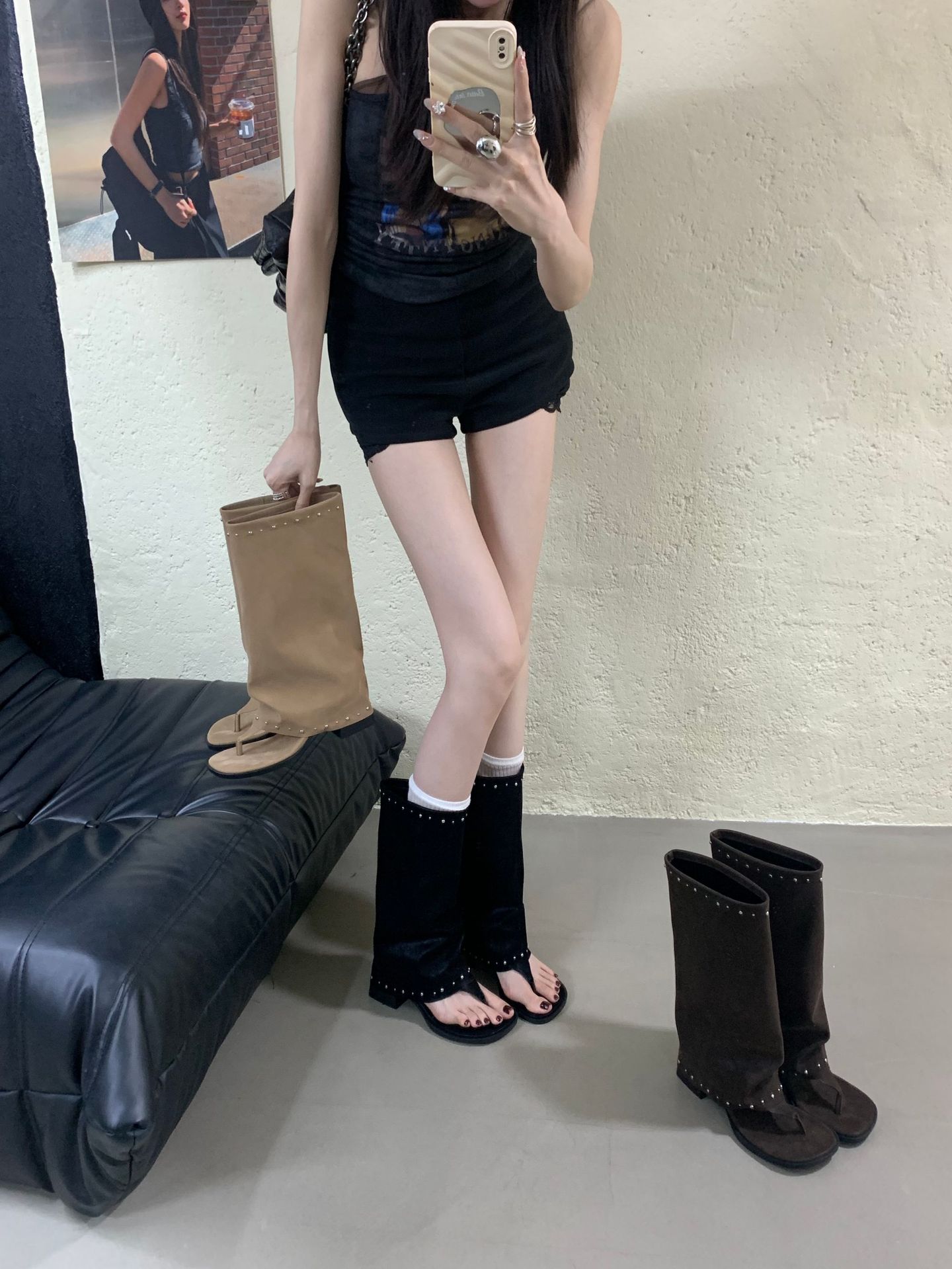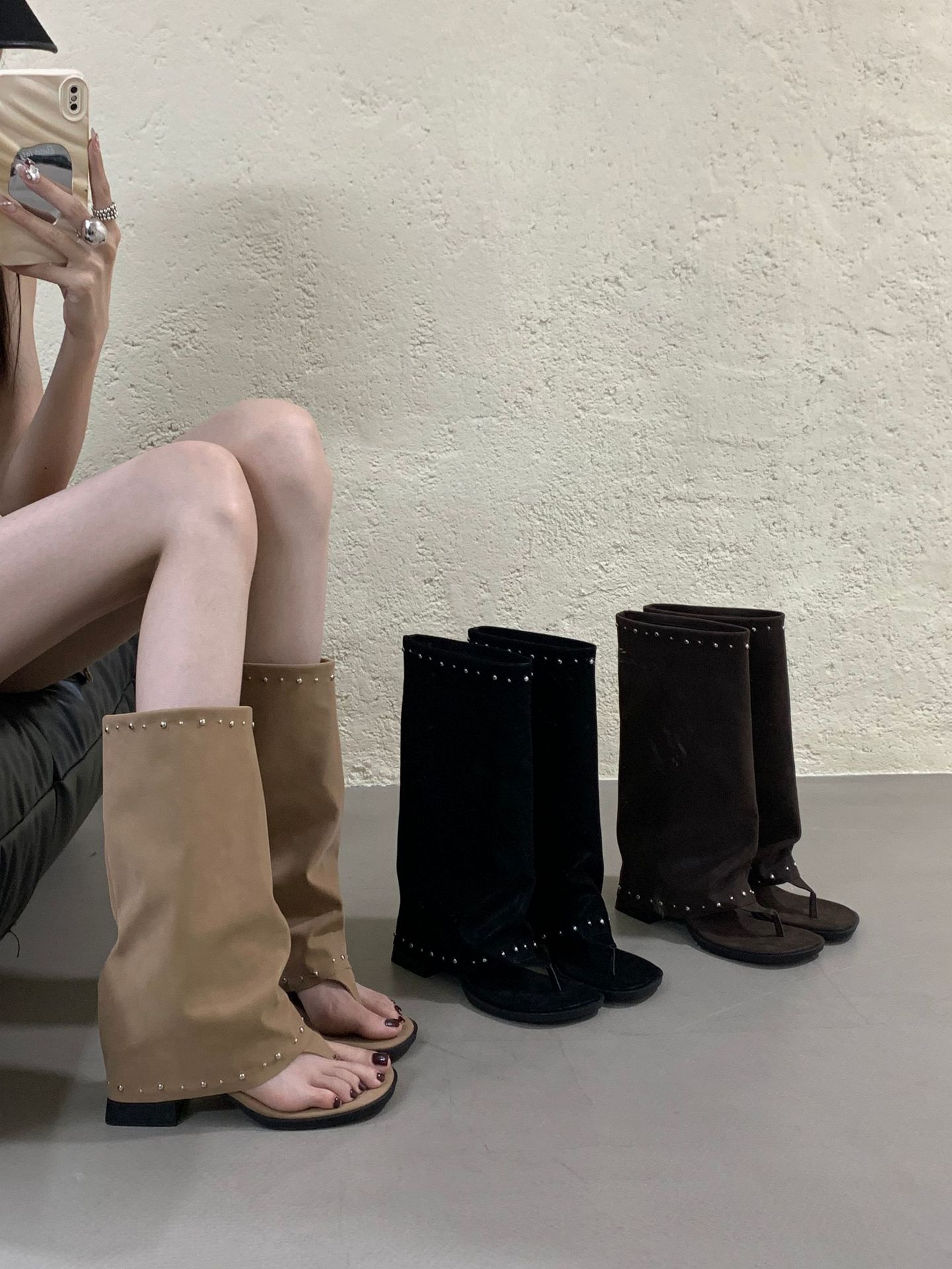 가벼운 럭셔리 틈새 복고풍 2025 여름 신작 여성 신발 샌들 겉옷 스퀘어 토 두꺼운 굽 플립 플롭 리벳 바지 샌들