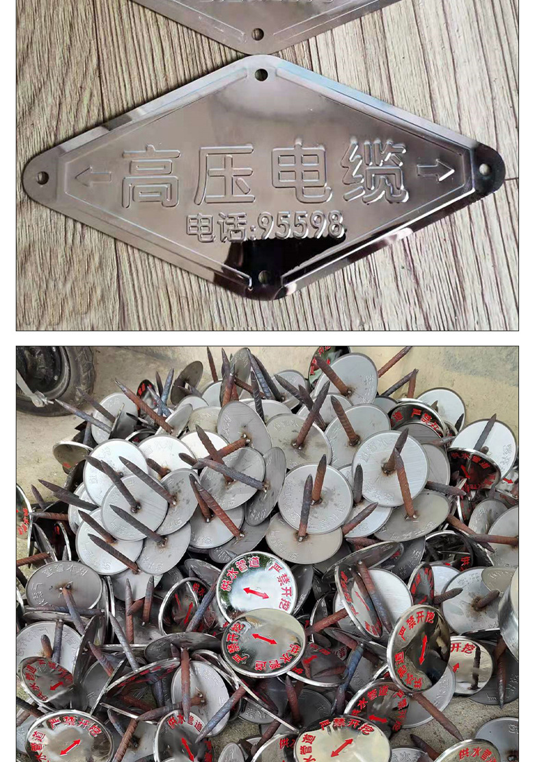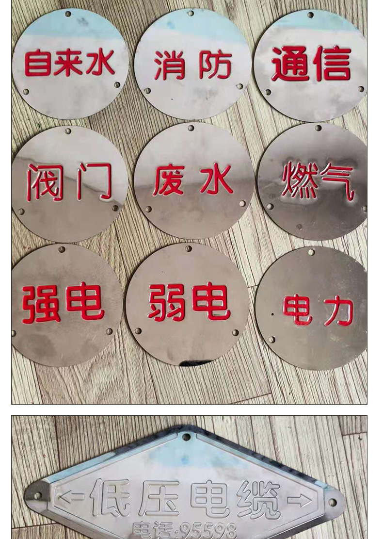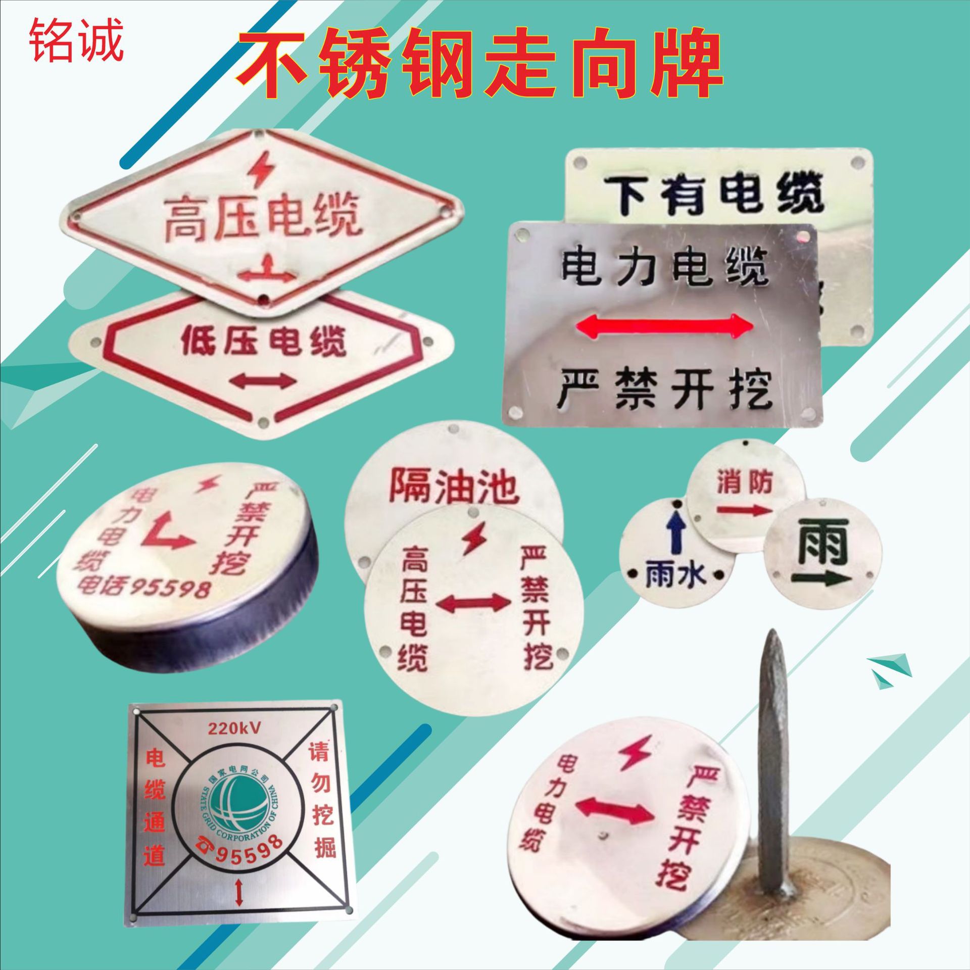 스테인리스 지면 표지판 아래에는 케이블 표지판, 가스 배관 표지판, 배수관 표지판이 있습니다.